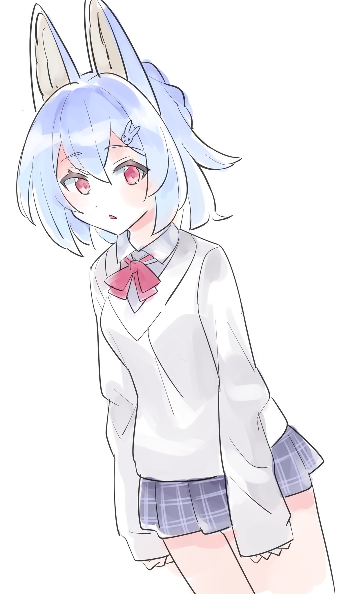 1girl alternate_costume animal_ears blue_hair blue_skirt blush bow bowtie braid breasts collared_shirt cowboy_shot dutch_angle female_focus fluffy_(world_flipper) fox_ears fox_girl grey_sweater hair_ornament hairclip highres jpeg_artifacts komuro_takahiro light_blush long_sleeves looking_at_viewer miniskirt open_mouth plaid_clothes plaid_skirt pleated_skirt rabbit_hair_ornament red_bow red_bowtie red_eyes school_uniform shirt short_hair sidelocks simple_background sketch skirt sleeves_past_wrists small_breasts solo standing sweater white_background white_shirt world_flipper