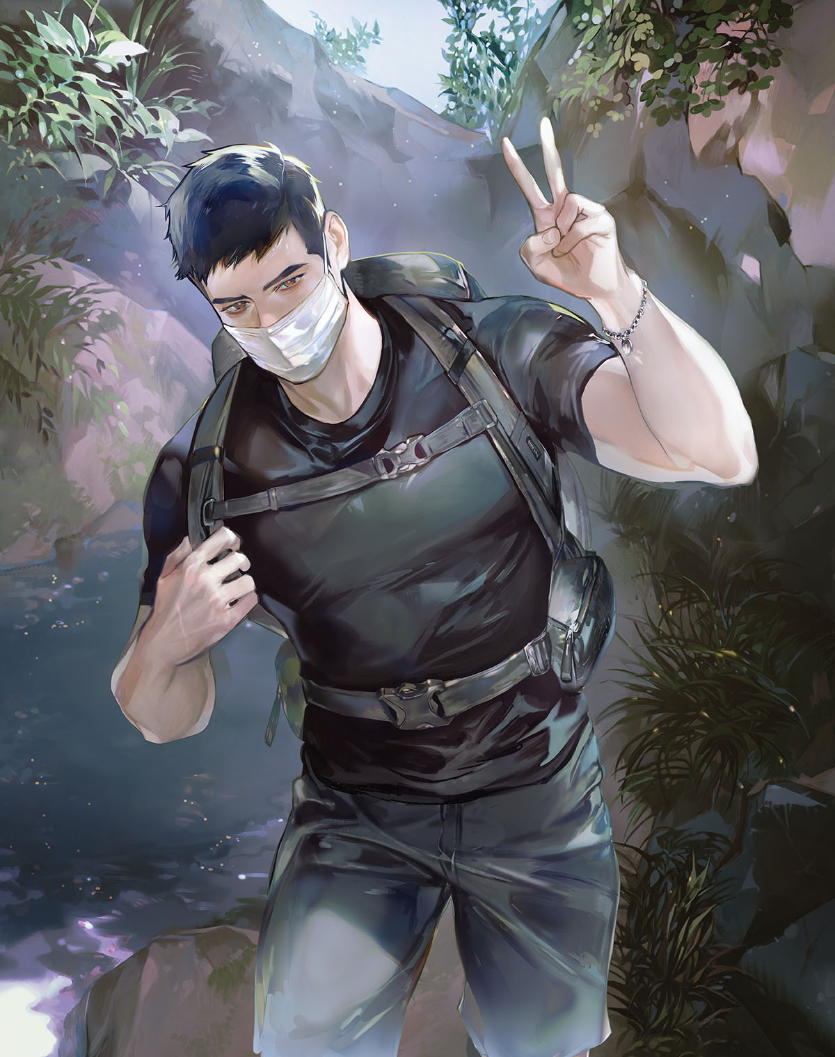 1boy backpack bag bracelet buckle character_request denim harness highres jeans jewelry korean_commentary male_focus mask original pants pouch puppy_1ove red_eyes short_hair stream v