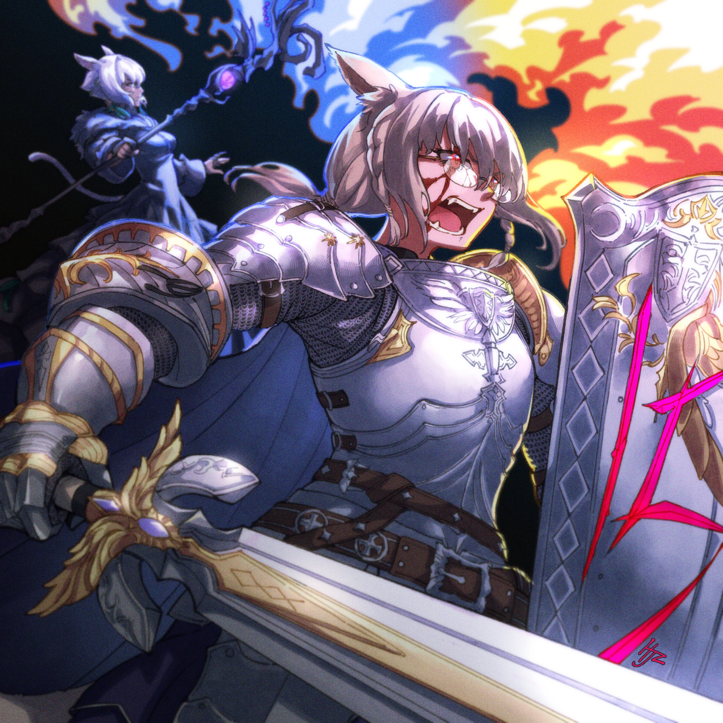 2girls absurdres armor artist_name warrior_of_light_(ff14) belt blood blood_on_face braid brown_hair cape chainmail fangs film_grain final_fantasy final_fantasy_xiv fire glasses highres hjz_(artemi) holding holding_sword holding_weapon miqo'te multiple_girls paladin_(final_fantasy) plate_armor red_eyes shield staff sword weapon white_hair y'shtola_rhul