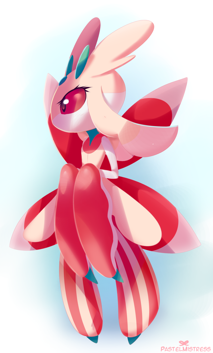 1girl antennae arthropod_girl artist_name bad_deviantart_id bad_id black_eyes blue_background blush colored_sclera colored_skin female_focus flat_chest full_body furry furry_female gen_7_pokemon gradient_background hands_up highres light_blush looking_to_the_side lurantis multicolored_skin nintendo no_mouth pastelmistress pink_sclera pink_skin pokemon pokemon_(creature) signature simple_background solo standing white_skin