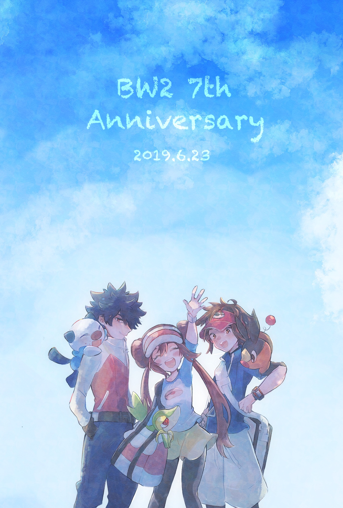 1girl 2boys anniversary arm_up bag black_hair black_pantyhose blue_jacket breasts brown_hair closed_eyes cloud commentary_request dated day double_bun eyelashes gen_5_pokemon hair_bun hand_in_pocket highres hugh_(pokemon) jacket long_hair misha_(ohds101) multiple_boys nate_(pokemon) nintendo oshawott outdoors pants pantyhose pokemon pokemon_(creature) pokemon_bw2 pokemon_on_back red_headwear rosa_(pokemon) shirt short_hair shorts shoulder_bag sky smile snivy spiked_hair tepig twintails visor_cap yellow_shorts