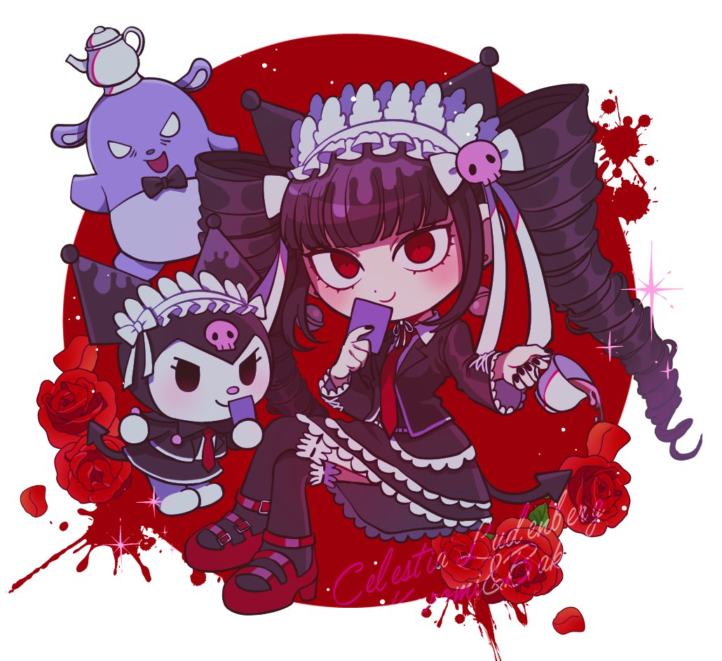 1girl black_bow black_jacket black_nails black_skirt black_thighhighs blunt_bangs blush bong_(0u0bon) bow cat celestia_ludenberg character_name commentary copyright_request cup danganronpa:_trigger_happy_havoc danganronpa_(series) drill_hair earrings flower frilled_skirt frills gothic_lolita hair_ornament holding holding_cup jacket jewelry kuromi layered_skirt lolita_fashion long_sleeves looking_at_viewer my_melody_(series) nail_polish necktie open_clothes open_jacket over-kneehighs red_background red_eyes red_flower red_necktie red_rose red_shoes rose sanrio shoes skirt smile solo sparkle spilling untranslatable_commentary thighhighs twin_drills white_background