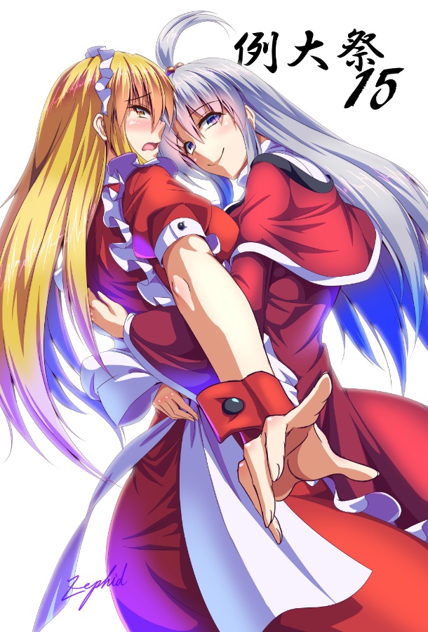 2girls ahoge apron ass back_bow blonde_hair bow breasts capelet dress dutch_angle grey_eyes hug long_hair maid maid_apron maid_headdress medium_breasts multiple_girls open_mouth puffy_short_sleeves puffy_sleeves red_capelet red_dress shinki_(touhou) short_sleeves silver_hair simple_background smile touhou touhou_(pc-98) translation_request white_background white_bow wrist_cuffs yellow_eyes yumeko_(touhou) zephid