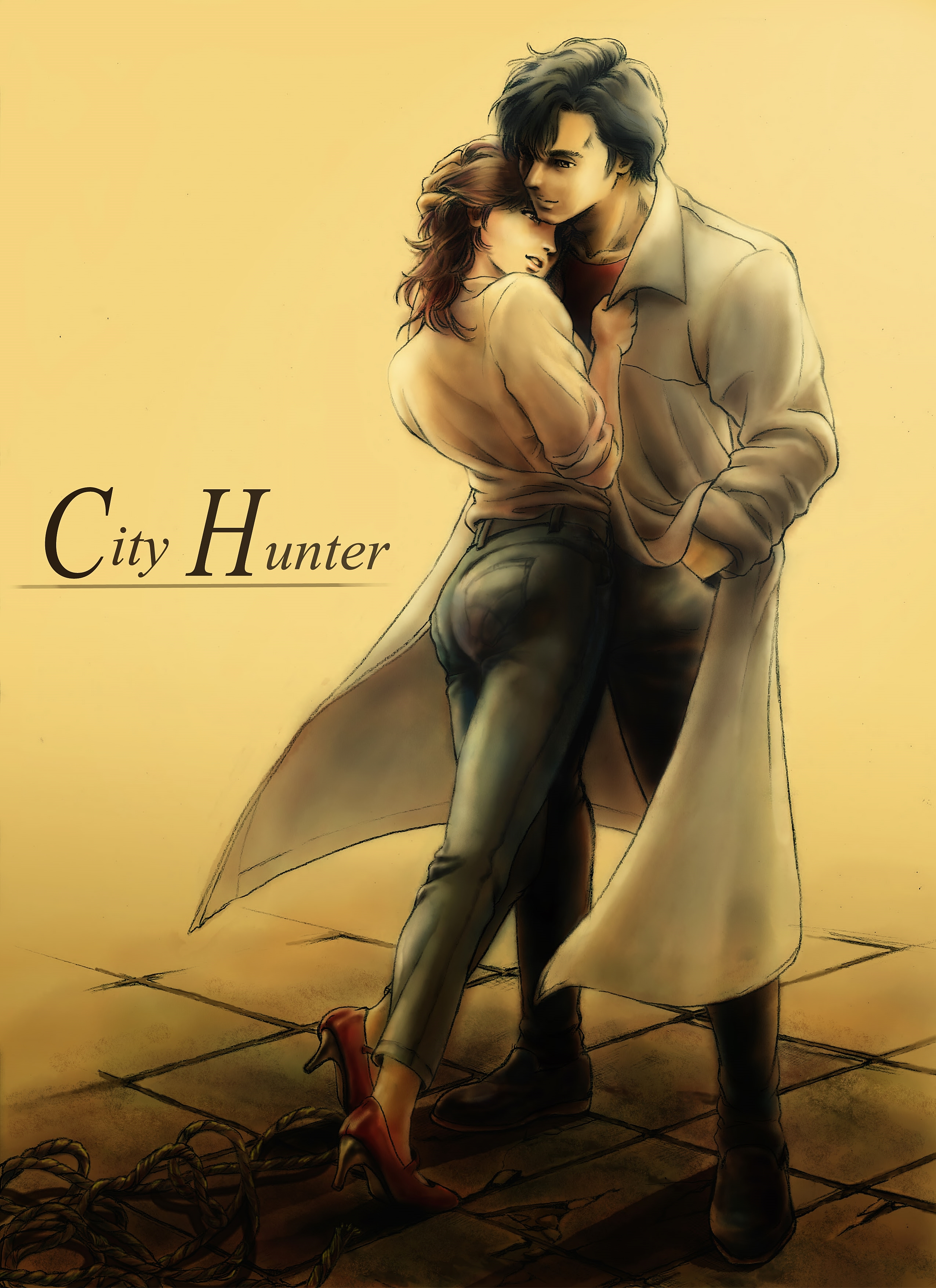 1boy 1girl absurdres bad_id bad_pixiv_id black_hair brown_hair city_hunter closed_mouth coat collarbone commentary_request copyright_name crack cracked_floor curly_hair denim full_body grabbing grey_coat hand_in_another's_hair hand_in_pocket head_tilt hetero high_heels highres holding_person jeans leaning_forward leaning_on_person looking_away looking_down makimura_kaori medium_hair no_socks oxfords pants parted_lips pavement red_footwear red_shirt rope saeba_ryou sepia shadow shirt smile standing standing_on_one_leg t-shirt trench_coat uirina