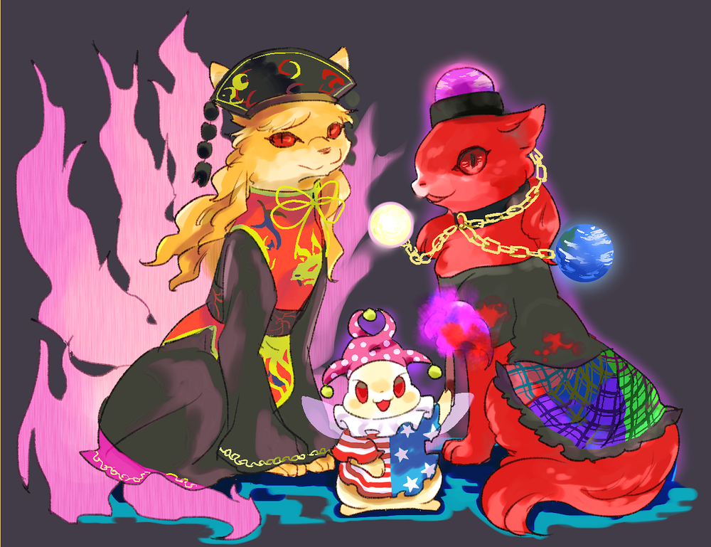 3girls american_flag_dress animal_ears animal_focus animal_hands aura black_background black_shirt chain chamaruk chinese_clothes clownpiece commentary commentary_request dog_ears dog_tail energy fairy_wings fox fox_ears fox_tail frilled_skirt frills furrification furry furry_female gold_chain hecatia_lapislazuli holding holding_torch junko_(touhou) junko_(touhou)_(fox) lying multicolored_skirt multiple_girls multiple_tails multiple_views neck_ruff open_mouth paw_print_soles phoenix_crown rabbit_ears red_eyes sharp_teeth shirt simple_background skirt slit_pupils tabard tail tassel teeth torch touhou transformation wings