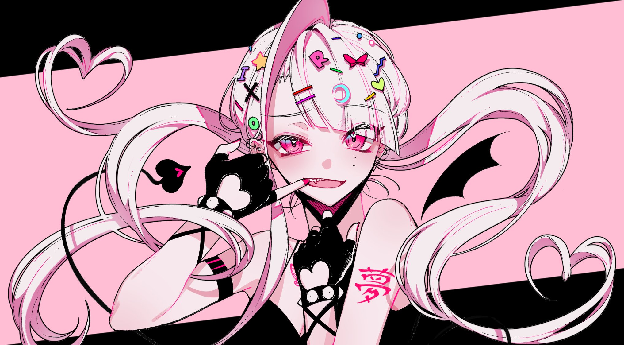 1girl bad_id bad_twitter_id black_gloves blush crescent crescent_hair_ornament dear:_(utaite) demon_tail fang fingerless_gloves floating_hair gloves hair_ornament hairclip highres indie_utaite mask_pull nail_polish original pink_eyes pink_hair pink_nails solo star_(symbol) star_hair_ornament tail twintails utaite vampire_(vocaloid) vocaloid xoco