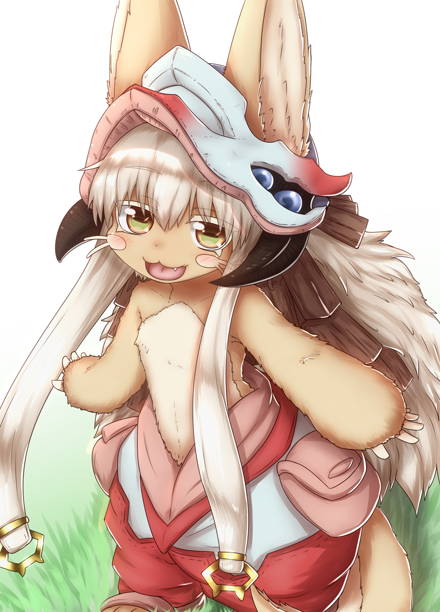 1other :3 animal_ears animal_hands blush blush_stickers body_fur brown_fur collarbone colored_eyelashes fake_horns fang furry gradient_background grass green_eyes happy helmet highres horizontal_pupils horned_headwear horns horokusa_(korai) light_blush long_hair looking_at_viewer made_in_abyss multicolored_headwear multicolored_pants nanachi_(made_in_abyss) open_mouth other_focus outdoors pants pouch puffy_pants sidelocks simple_background smile solo tail tongue topless_other two-tone_fur whiskers white_background white_hair