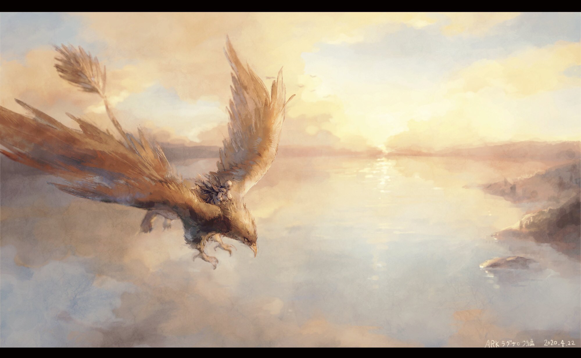 1boy artist_name blue_eyes character_name cloud dark-skinned_male dark_skin dated day earrings facing_away flying griffin highres ibrahim_(1st_costume)_(nijisanji) ibrahim_(nijisanji) jewelry lake letterboxed long_sleeves looking_away looking_to_the_side male_focus mamevv024 nature nijisanji outdoors reflection riding robe scenery short_hair sky sunrise virtual_youtuber