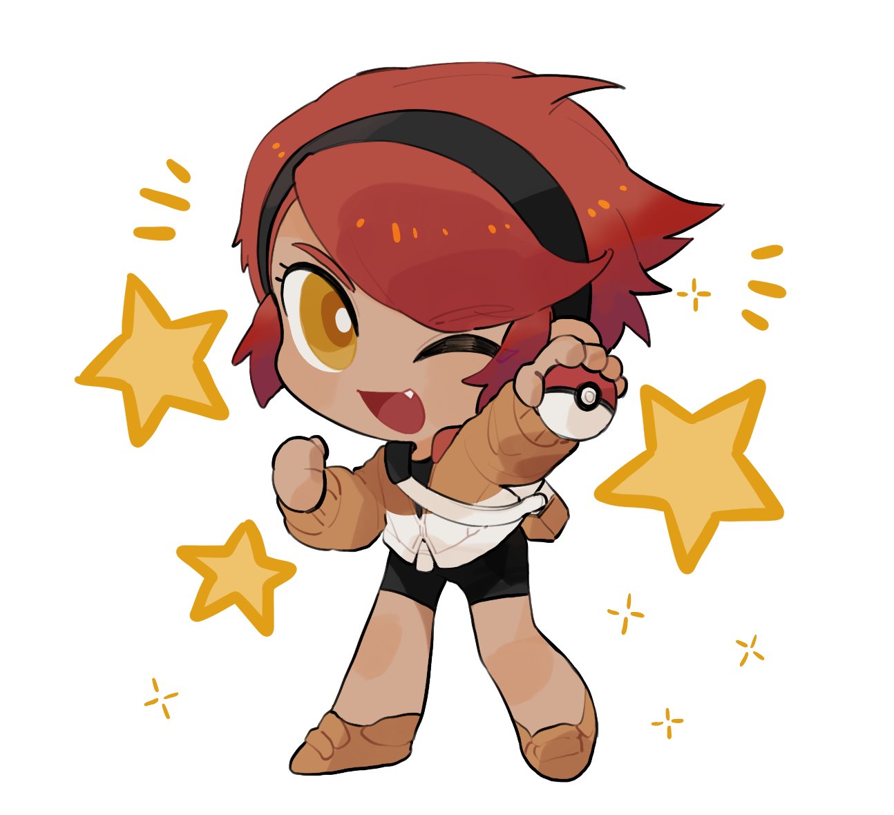 1girl ;d bag bike_shorts black_hairband black_sports_bra chibi commentary eyelashes fang full_body hairband holding holding_poke_ball jacket jiugong_chi multicolored_jacket nintendo notice_lines one_eye_closed open_mouth orange_hair orange_jacket orange_shoes partially_unzipped poke_ball poke_ball_(basic) pokemon pokemon_masters_ex shoes short_hair shoulder_bag smile sneakers solo sparkle sports_bra standing star_(symbol) swept_bangs untranslatable_commentary tina_(pokemon) tongue track_jacket two-tone_jacket white_bag white_jacket