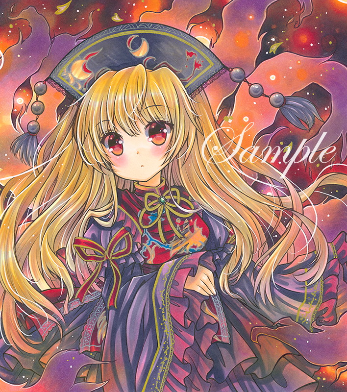 1girl black_headwear blonde_hair brooch chinese_clothes closed_mouth crescent frilled_sleeves frilled_tabard frills hair_between_eyes head_tilt jewelry juliet_sleeves junko_(touhou) long_hair long_sleeves looking_at_viewer marker_(medium) neck_ribbon orange_background phoenix_crown puffy_sleeves red_eyes red_ribbon red_tabard ribbon rui_(sugar3) sample_watermark sleeve_ribbon solo tabard touhou traditional_media very_long_hair watermark wide_sleeves