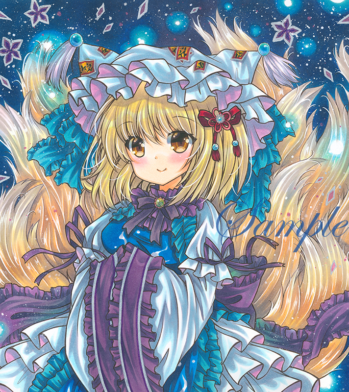 1girl animal_hat back_bow blonde_hair blue_background blue_eyes blue_tabard bow breasts brooch closed_mouth cowboy_shot dress floral_background fox_tail frilled_bow frilled_sleeves frilled_tabard frills hands_in_opposite_sleeves hat jewelry juliet_sleeves long_sleeves looking_at_viewer marker_(medium) medium_breasts mob_cap multiple_tails ofuda ofuda_on_clothes puffy_sleeves purple_bow purple_ribbon ribbon rui_(sugar3) sample_watermark sleeve_ribbon smile solo tabard tail touhou traditional_media watermark white_dress white_hat wide_sleeves yakumo_ran