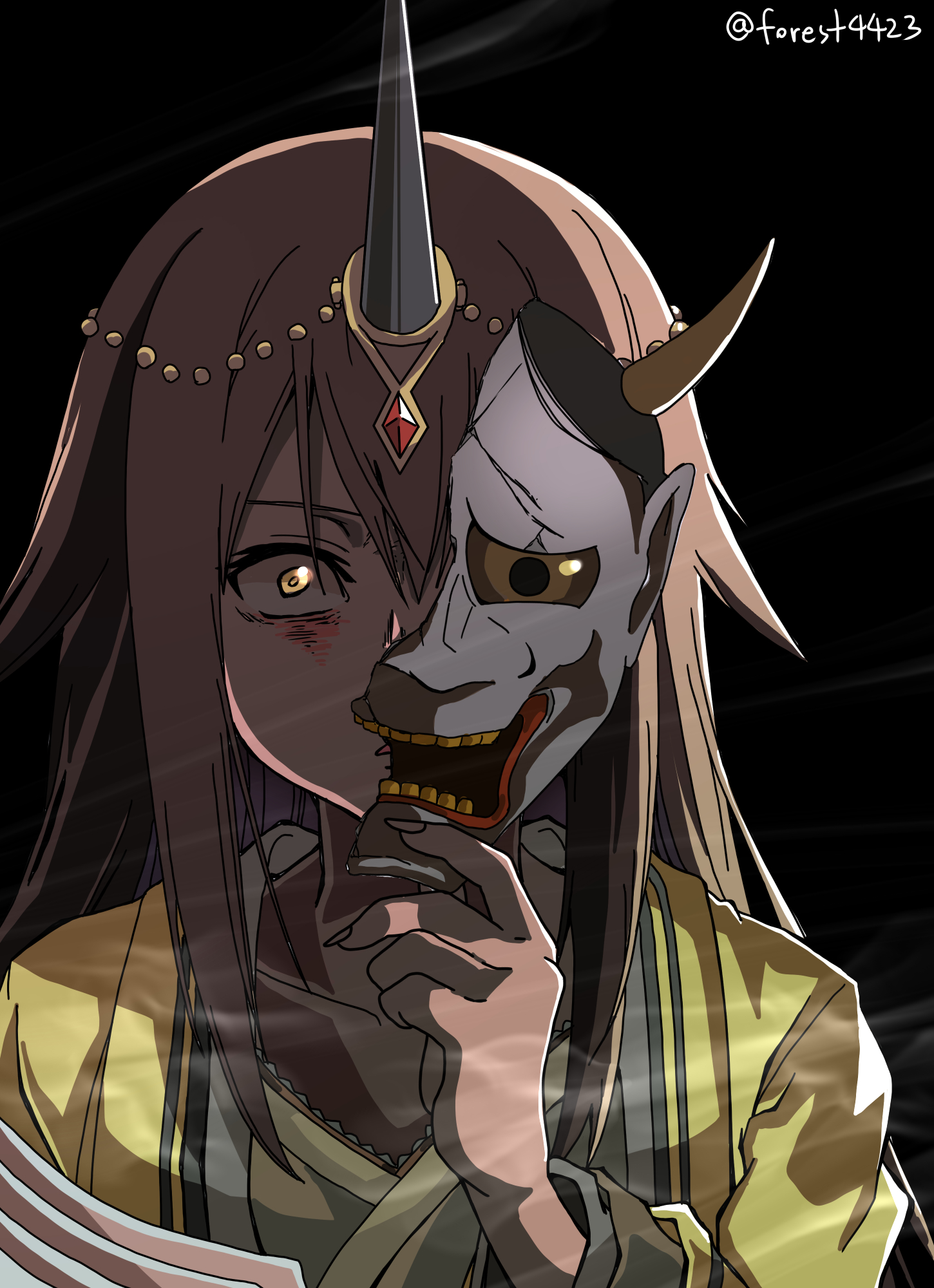 1girl angry black_background forest_(4423) glowing glowing_eye grey_hair half_mask hand_up highres holding holding_mask horns japanese_clothes kureha_yuna magia_record:_mahou_shoujo_madoka_magica_gaiden mahou_shoujo_madoka_magica mask mask_over_one_eye oni single_horn solo yellow_eyes