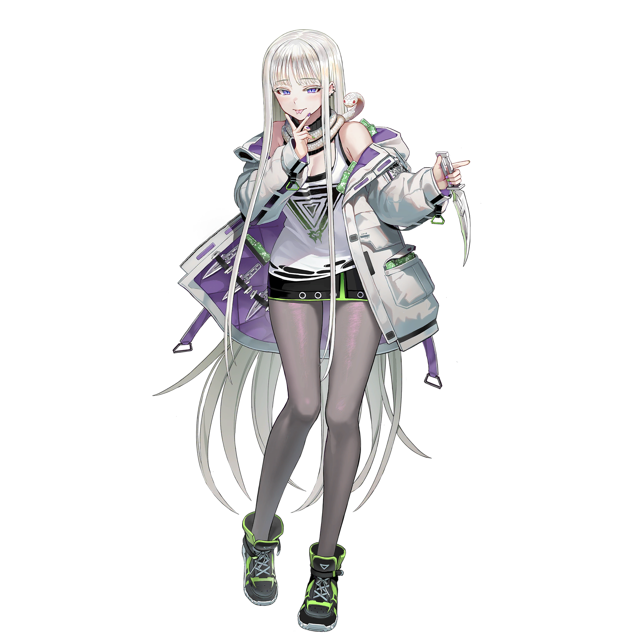 1girl :p black_skirt cheona_(last_origin) coat dagger forked_tongue full_body grey_pantyhose high_tops highres knife last_origin long_hair looking_at_viewer miniskirt nail_polish official_art pantyhose purple_eyes shoes silver_hair skirt smile snake sneakers solo tachi-e taesi tank_top throwing_knife tongue tongue_out transparent_background very_long_hair weapon