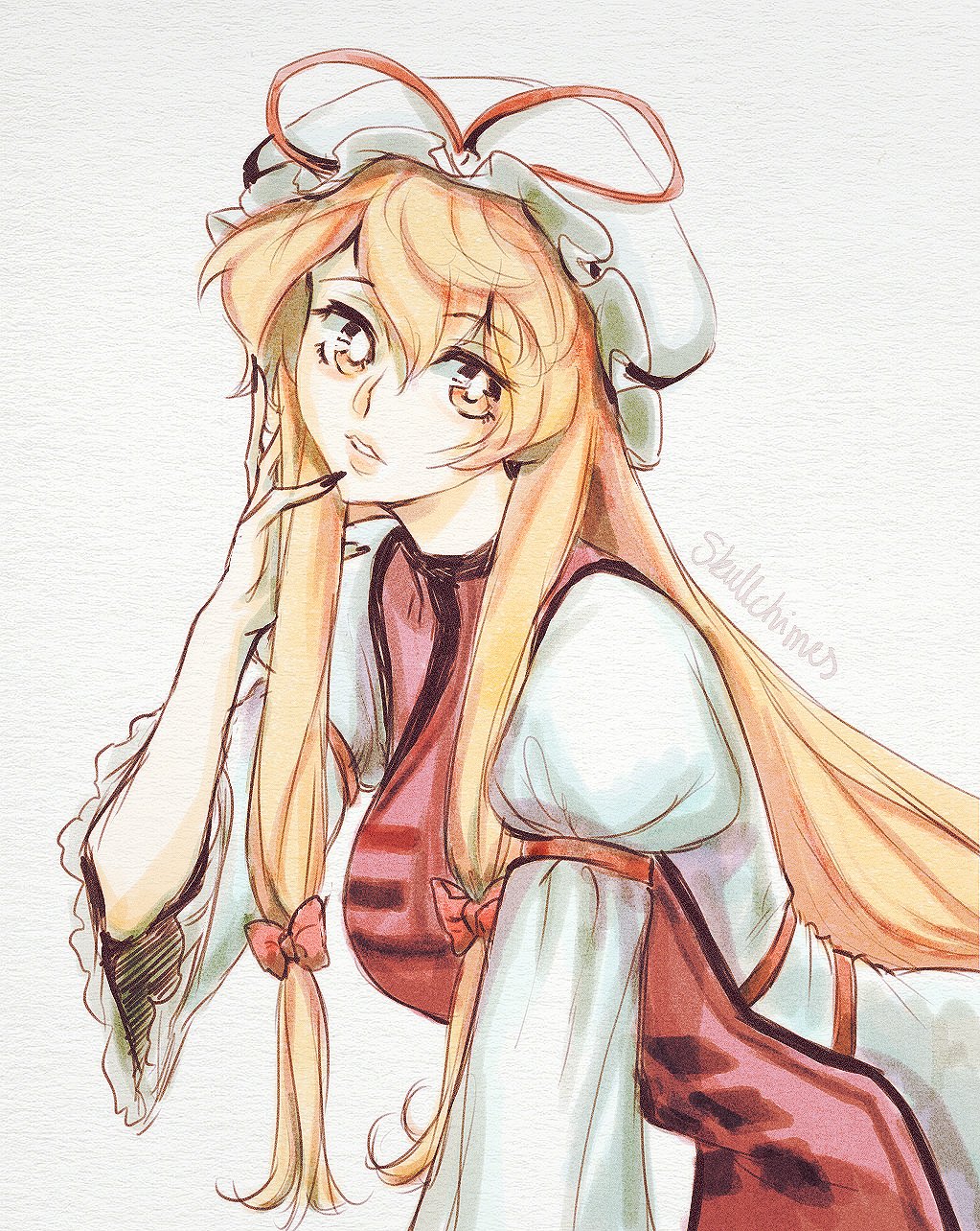 1girl alternate_color alternate_eye_color blonde_hair bow breasts bright_pupils dress eyelashes eyes_visible_through_hair hair_bow hair_ribbon hand_in_own_hair hand_up hat hat_ribbon highres large_breasts leaning_forward lips long_dress long_hair long_sleeves looking_to_the_side mob_cap multi-tied_hair parted_lips puffy_long_sleeves puffy_sleeves red_bow retro_artstyle ribbon simple_background skullchimes sleeve_ribbon solo tabard touhou trigram twitter_username white_background white_dress white_hat white_pupils wide_sleeves yakumo_yukari yellow_eyes