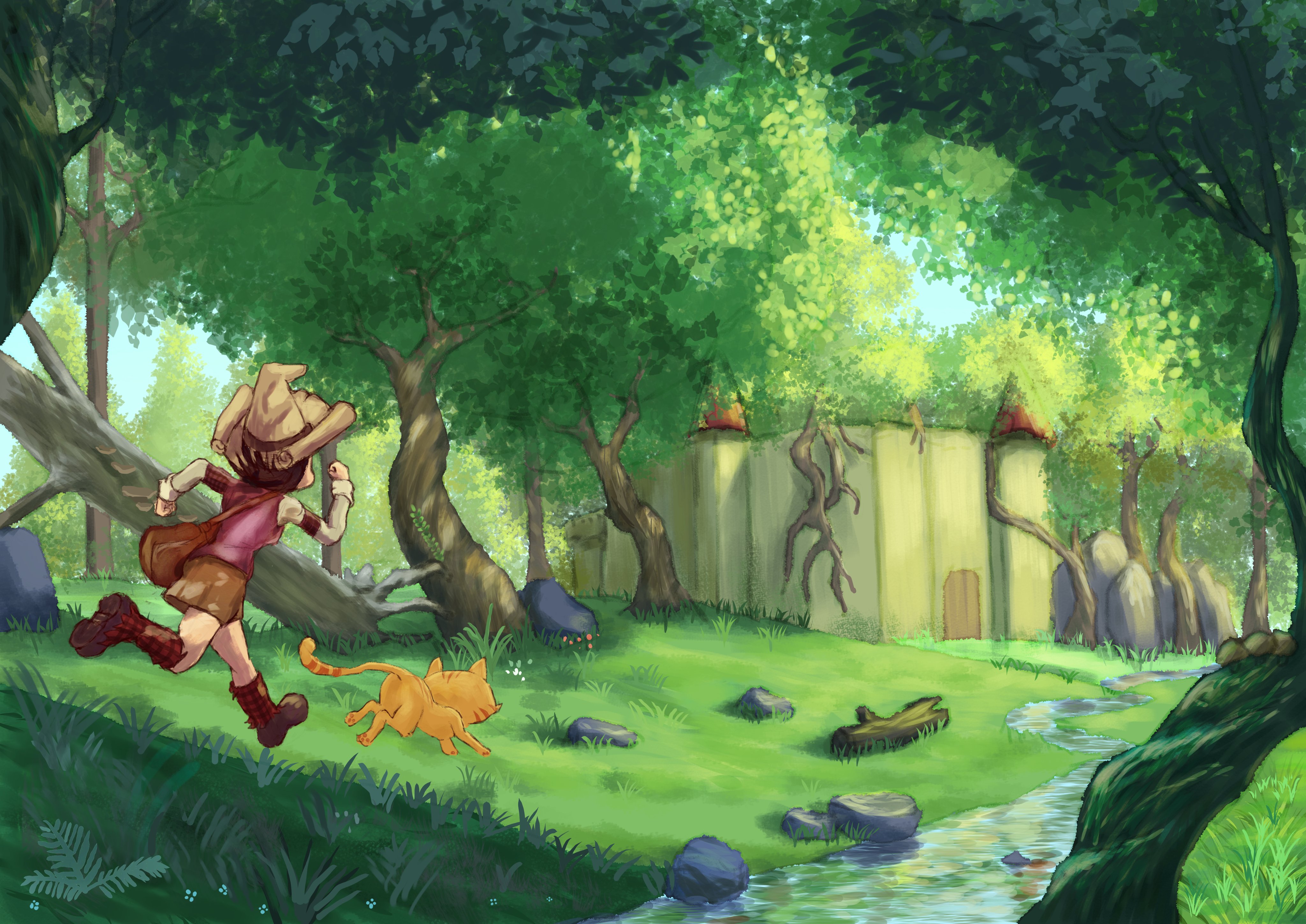 1girl absurdres arm_warmers bag black_hair boots brown_footwear carrot_(pepper_and_carrot) castle cat clenched_hands david_revoy derivative_work facing_away familiar flower forest fortress grass hat highres leather leather_boots leg_warmers log looking_afar comic_panel_redraw moss mushroom nature orange_cat patch pepper_(pepper_and_carrot) pepper_and_carrot plant redrawn running shiromame shoulder_bag skirt stream tree vest vines witch_hat