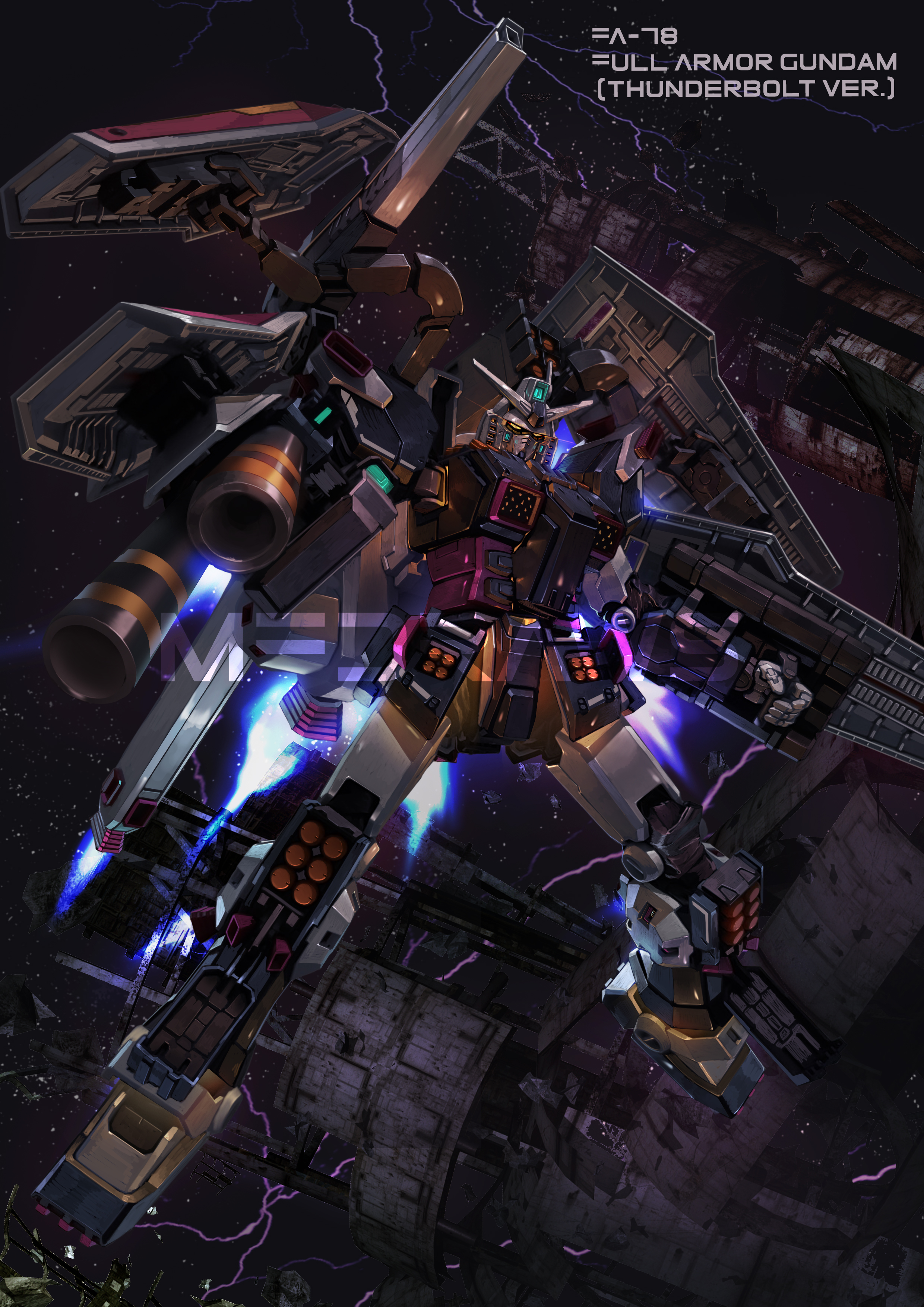 absurdres character_name flying full_armor_gundam gundam gundam_thunderbolt highres looking_down mecha mf_draws missile_pod mobile_suit no_humans robot science_fiction shield solo space thrusters v-fin
