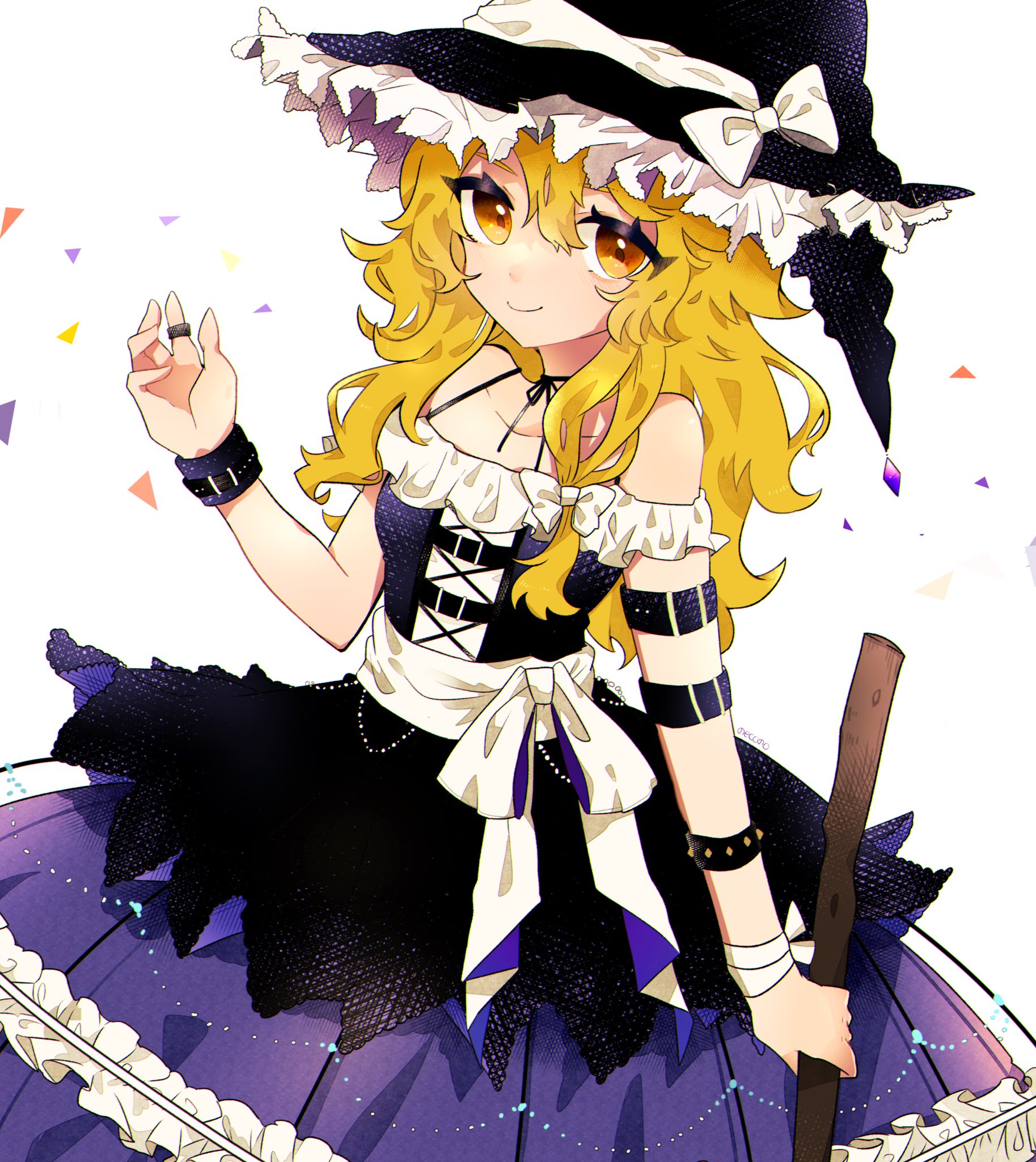 1girl alternate_costume arm_garter bandages bare_shoulders beads black_choker black_dress black_hat blonde_hair blush bow breasts broom buckle choker closed_mouth collarbone commentary_request confetti dress eyelashes frilled_dress frills hair_between_eyes hat highres holding holding_broom jewelry kirisame_marisa necono_(nyu6poko) off-shoulder_dress off_shoulder ribbon ribbon_choker ring sash sidelocks simple_background small_breasts smile solo standing touhou white_background white_bow white_ribbon white_sash witch_hat yellow_eyes