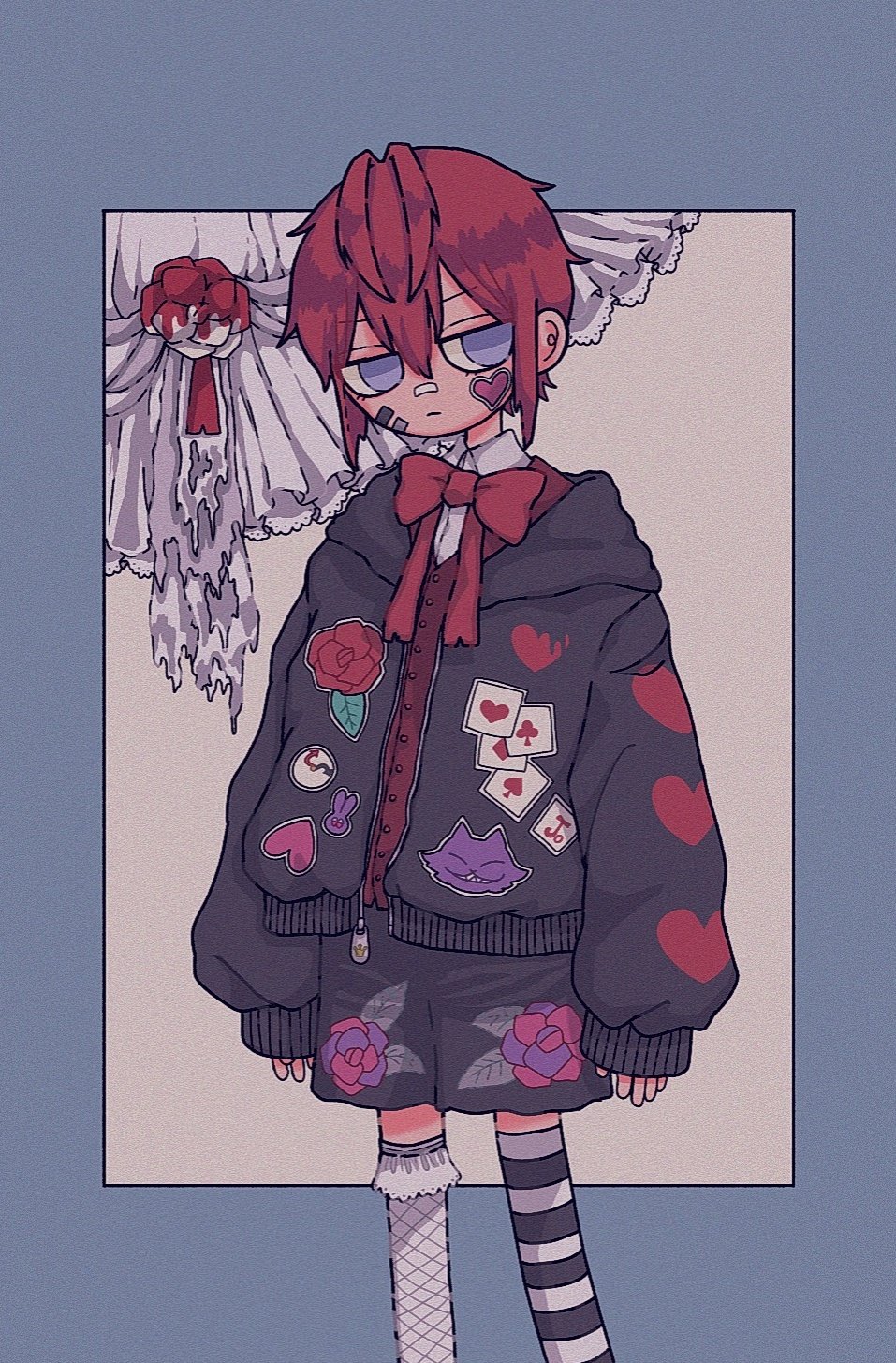 1boy asymmetrical_legwear black_shorts blue_border border bow bowtie feet_out_of_frame flower grey_eyes highres long_sleeves print_shorts purple_flower red_bow red_bowtie red_hair riddle_rosehearts sakura_szm short_hair shorts sleeves_past_wrists solo sticker twisted_wonderland zipper_pull_tab
