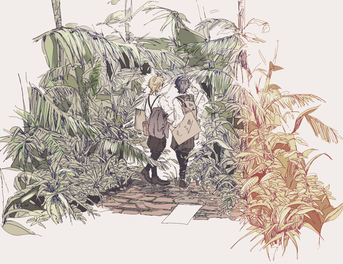 2boys black_hair blonde_hair dio_brando from_behind jojo_no_kimyou_na_bouken jonathan_joestar male_focus motunikomi multiple_boys muted_color phantom_blood plant scenery walking