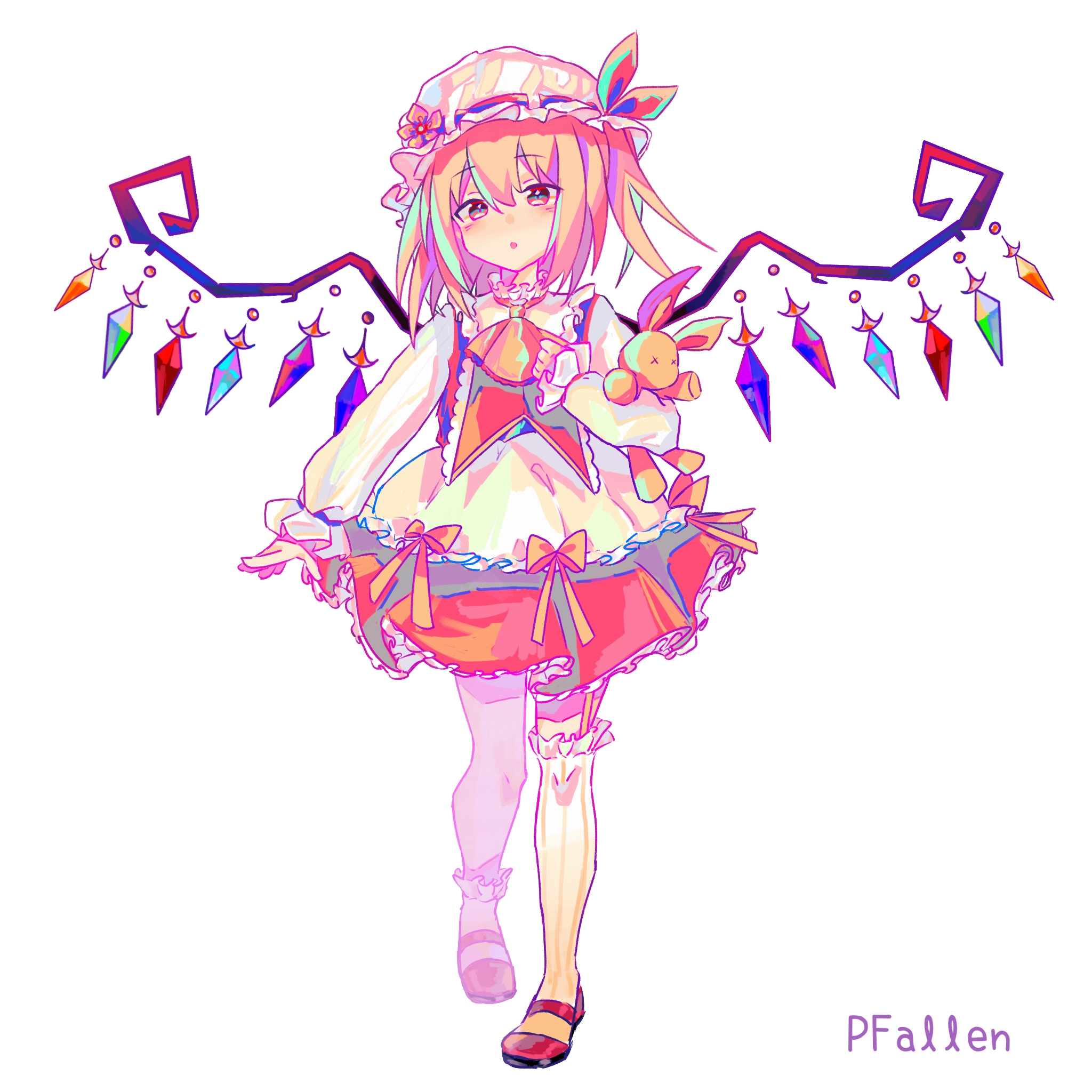 1girl :o adapted_costume artist_request blonde_hair crystal flandre_scarlet full_body hat highres holding holding_stuffed_toy looking_at_viewer medium_hair mob_cap over-kneehighs pfallen red_eyes solo stuffed_toy thighhighs touhou wings