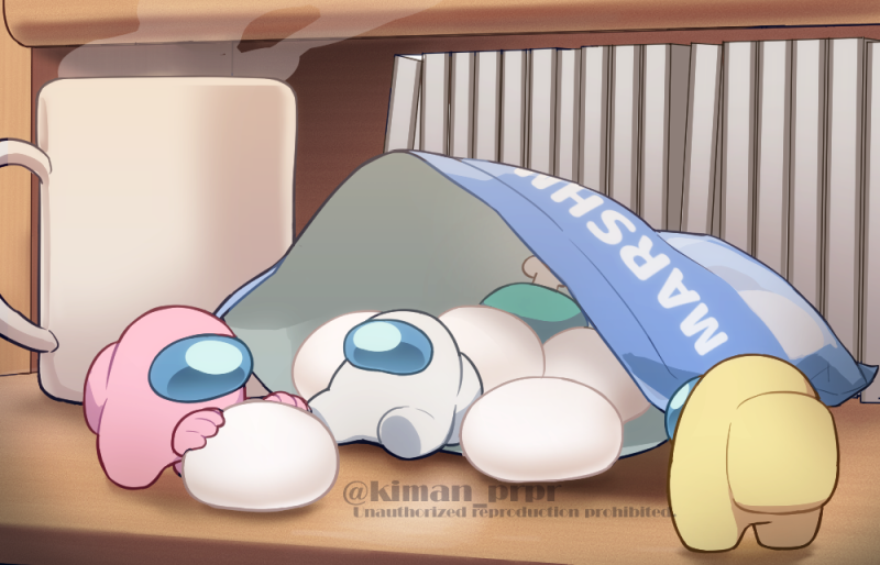 4others ambiguous_gender among_us bag banana_(among_us) book commentary_request creature crewmate_(among_us) cup disembodied_hand english_text food full_body grey_(among_us) helmet kiman marshmallow miniature mug multiple_others rose_(among_us) shelf space_helmet spacesuit steam twitter_username white_(among_us)