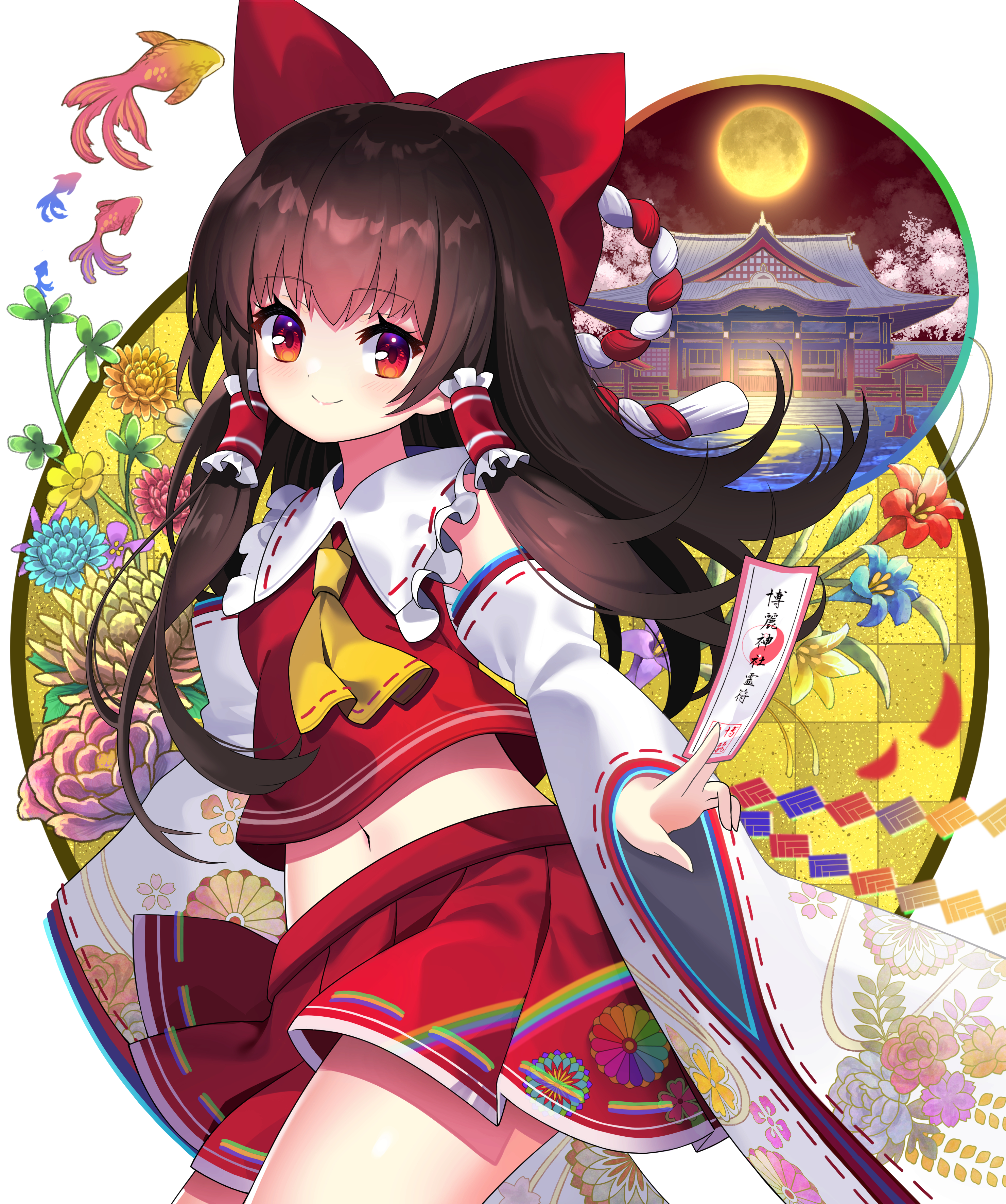 1girl absurdres ascot between_fingers blue_flower bow brown_hair closed_mouth cowboy_shot detached_sleeves fish floral_background floral_print flower full_moon hair_bow hair_tubes hakurei_reimu highres holding long_hair looking_at_viewer midriff_peek miniskirt moon multicolored_skirt navel night nontraditional_miko pink_flower pleated_skirt rainbow_print red_bow red_eyes red_flower red_shirt red_skirt ribbon-trimmed_skirt ribbon-trimmed_sleeves ribbon_trim shirt shrine skirt skirt_set smile solo standing touhou wide_sleeves yellow_ascot yellow_flower yellow_moon yuujin_(yuzinn333)