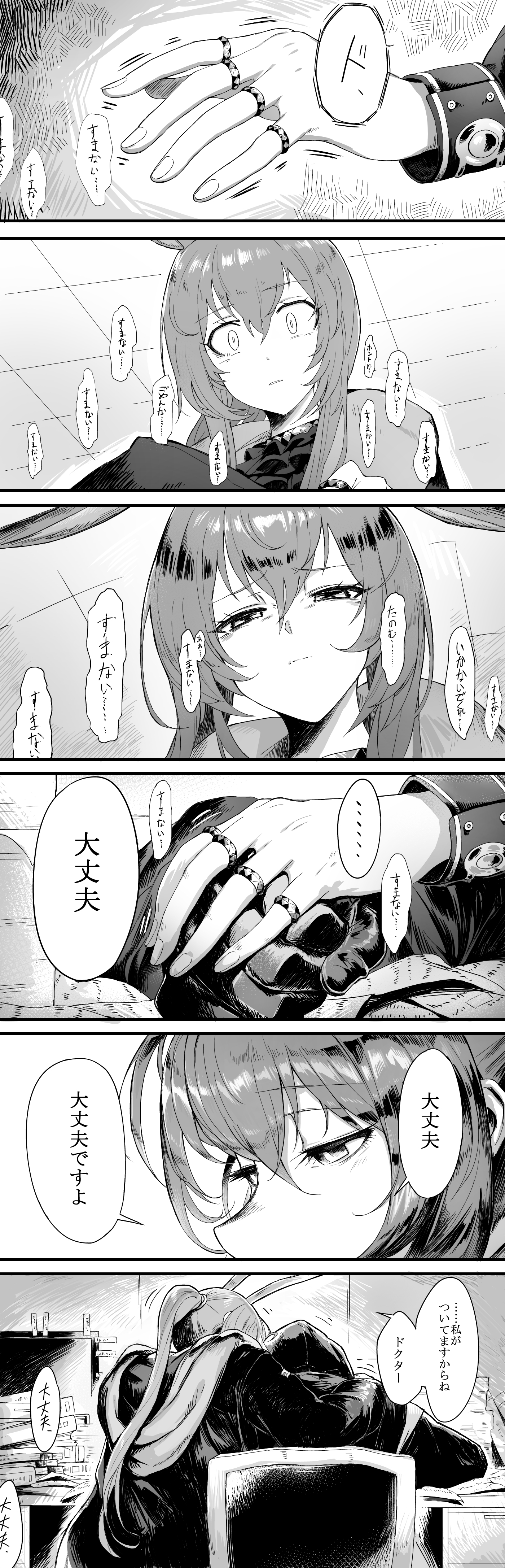 1girl 1other absurdres amiya_(arknights) animal_ears arknights book book_stack chair coat constricted_pupils desk doctor_(arknights) fingernails greyscale hair_between_eyes hand_on_another's_hand head_on_table highres hood hood_down hood_up jewelry long_hair long_sleeves milmir monochrome multiple_rings rabbit_ears ring translation_request