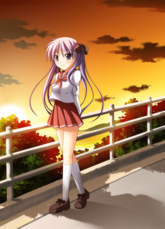 00s 1girl bad_id bad_pixiv_id blue_eyes female_focus hair_ribbon hiiragi_kagami long_hair long_legs lucky_star pleated_skirt purple_hair ribbon school_uniform serafuku skirt sky smile solo sunset tsuda_akira tsurime twintails