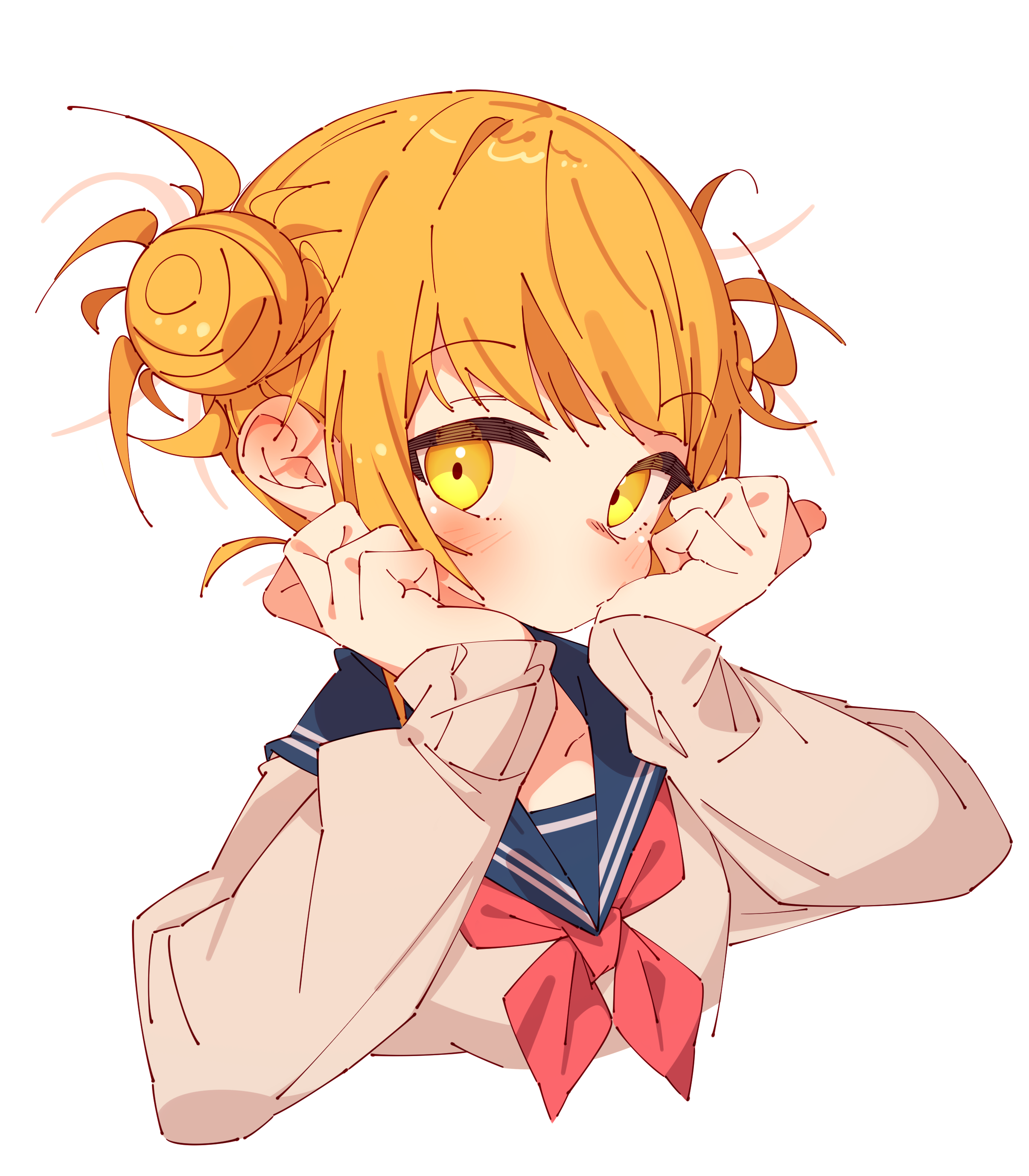 1girl absurdres blonde_hair blunt_bangs blush boku_no_hero_academia cardigan double_bun hair_bun highres messy_hair rasusurasu school_uniform serafuku sidelocks simple_background solo swept_bangs toga_himiko white_background yellow_eyes