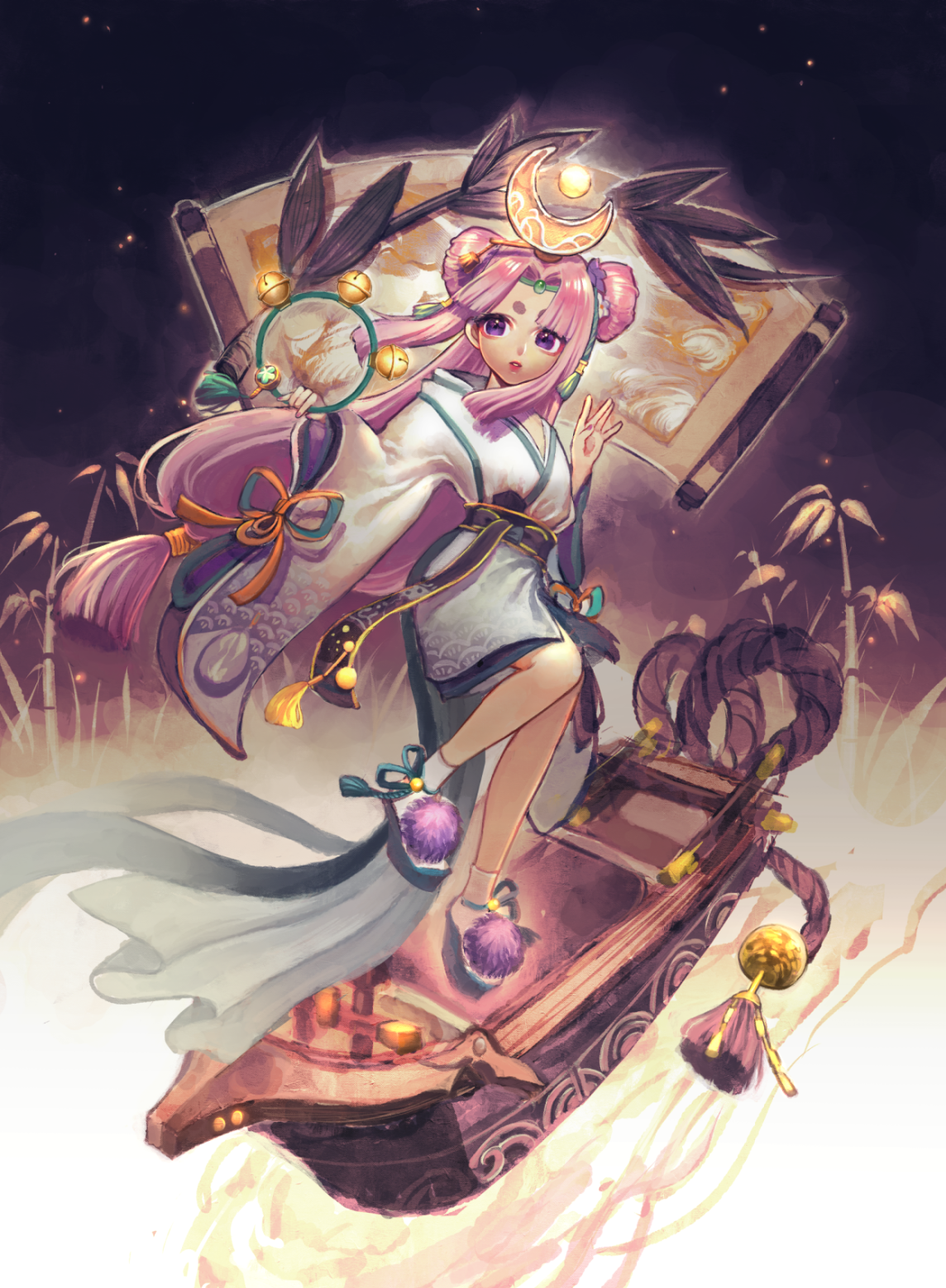 bamboo double_bun eyeliner floating_hair hair_bun hair_ornament hands_up highres holding japanese_clothes kaguya_(onmyoji) long_hair looking_to_the_side makeup night onmyoji orange8331 parted_bangs parted_lips pom_pom_(clothes) purple_eyes purple_hair purple_theme sandals short_eyebrows sky tabi tassel very_long_hair wind