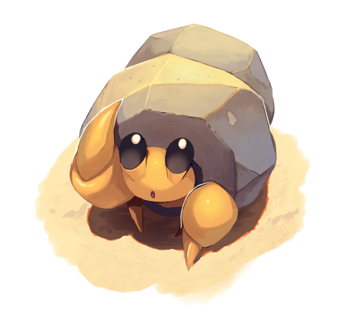 :o brown_eyes commentary_request dwebble gen_5_pokemon highres looking_up nanashi_nasi nintendo no_humans open_mouth pokemon pokemon_(creature) sand shell solo standing white_background