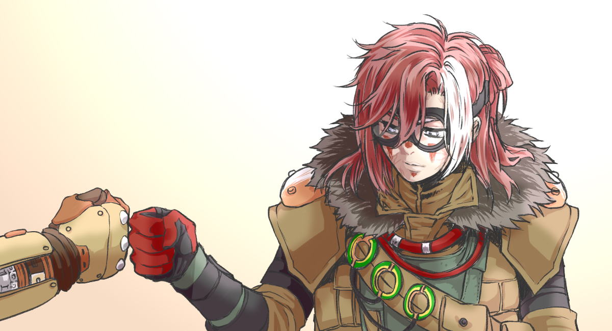 1boy 1other androgynous animification apex_legends bloodhound_(apex_legends) brown_jacket cable fist_bump fur_trim fuse_(apex_legends) gloves goggles grey_eyes hair_behind_ear jacket looking_down mechanical_arms medium_hair meteolance red_gloves red_hair single_mechanical_arm white_hair