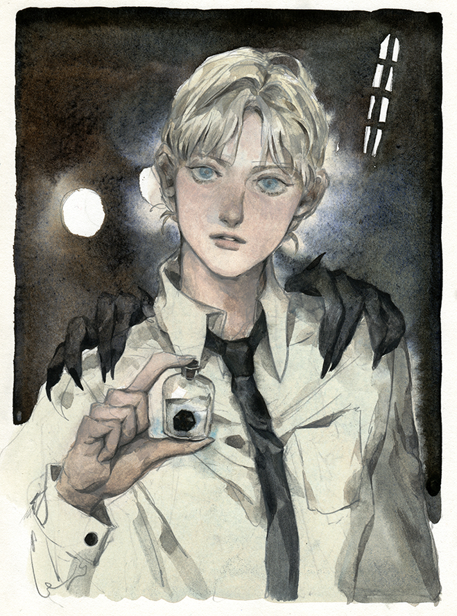 1girl blonde_hair blue_eyes bottle breadmonster collared_shirt darkness hand_up hands_on_shoulders holding horror_(theme) looking_at_viewer necktie original painting_(medium) parted_bangs parted_lips shirt traditional_media updo watercolor_(medium)