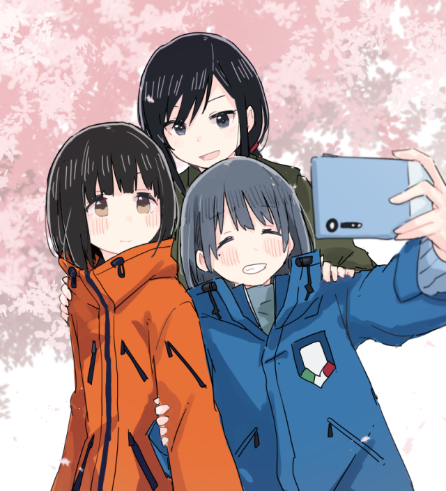3girls ^_^ black_eyes black_hair blue_hair blush brown_eyes cellphone cherry_blossoms closed_eyes eniwa_shii grin jacket koguma_(super_cub) multiple_girls phone ponytail reiko_(super_cub) selfie shiroshi_(denpa_eshidan) short_hair smartphone smile super_cub