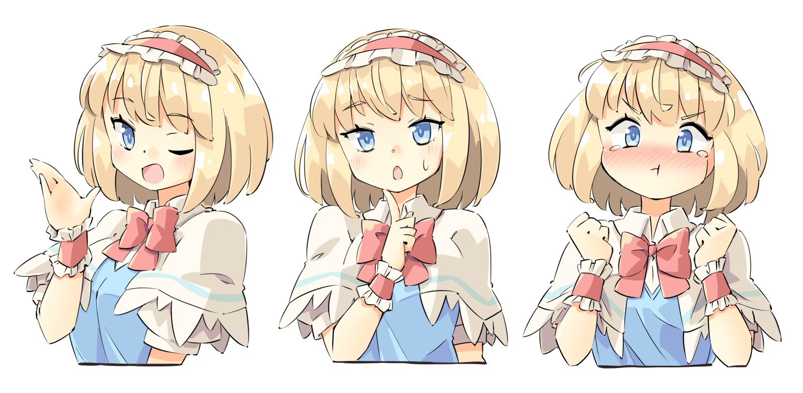 1girl :o :t ;d alice_margatroid annoyed arnest blonde_hair blue_eyes blush bob_cut bow bowtie capelet clenched_hands closed_mouth cropped_torso dot_nose multiple_expressions finger_to_own_chin frilled_cuffs frilled_hairband frills from_side full-face_blush furrowed_brow hairband hand_up hands_up highres index_finger_raised lolita_hairband looking_at_viewer looking_to_the_side multiple_views no_nose nose_blush one_eye_closed open_mouth pale_color parted_lips pout puffy_short_sleeves puffy_sleeves raised_eyebrow red_bow red_bowtie red_hairband shiny_skin short_hair short_sleeves simple_background smile straight-on sweat tearing_up touhou upper_body v-shaped_eyebrows white_background white_capelet wide-eyed wing_collar wrist_cuffs