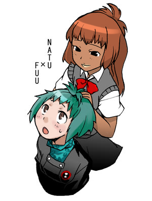 2girls atlus bow dark-skinned_female dark_skin lowres moriyama_natsuki multiple_girls persona persona_3 simple_background yamagishi_fuuka