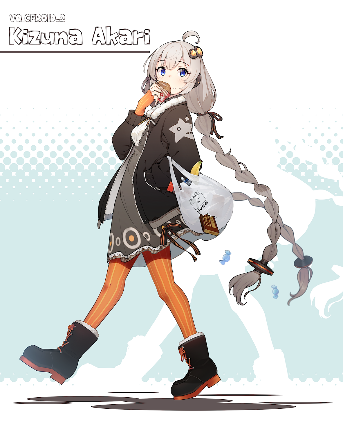 1girl ahoge bag banana black_boots black_jacket blue_eyes boots braid breasts character_name commentary_request dress eating fingerless_gloves food fruit full_body fur-trimmed_jacket fur_trim gloves grey_dress grey_hair hair_ornament hair_ribbon hand_in_pocket highres holding holding_food jacker jacket kizuna_akari long_hair niconico orange_gloves orange_pantyhose pantyhose plastic_bag ribbon shadow shirinda_fureiru simple_background solo star_(symbol) striped_clothes striped_pantyhose terebi-chan twin_braids very_long_hair vocaloid voiceroid walking