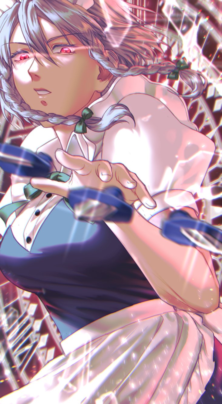 1girl apron arumimangotroid blue_dress bow bowtie braid clock collar danmaku dress green_bow green_bowtie highres izayoi_sakuya knife maid maid_headdress open_mouth puffy_short_sleeves puffy_sleeves red_eyes short_hair short_sleeves silver_hair solo touhou twin_braids waist_apron white_collar