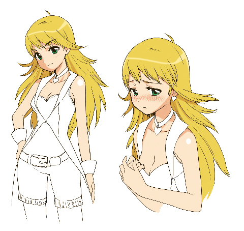 00s 1girl blonde_hair breasts cleavage cool_&_sexy_(idolmaster) hoshii_miki idolmaster idolmaster_(classic) idolmaster_1 lowres madara_sai medium_breasts simple_background
