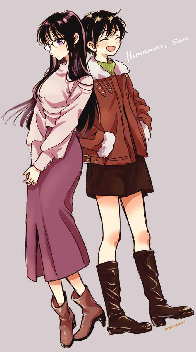 2girls :d ankle_boots black-framed_eyewear blush boots breasts brown_boots brown_jacket brown_skirt character_name closed_eyes commentary_request copyright_name full_body fur-trimmed_jacket fur_trim glasses grey_background hands_in_pockets happy high_heel_boots high_heels highres himawari-san himawari-san_(character) jacket kazamatsuri_fuuko knee_boots long_hair long_skirt long_sleeves multiple_girls open_mouth own_hands_together purple_eyes purple_skirt shirt short_hair signature simple_background skirt smile standing sugano_manami turtleneck v_arms