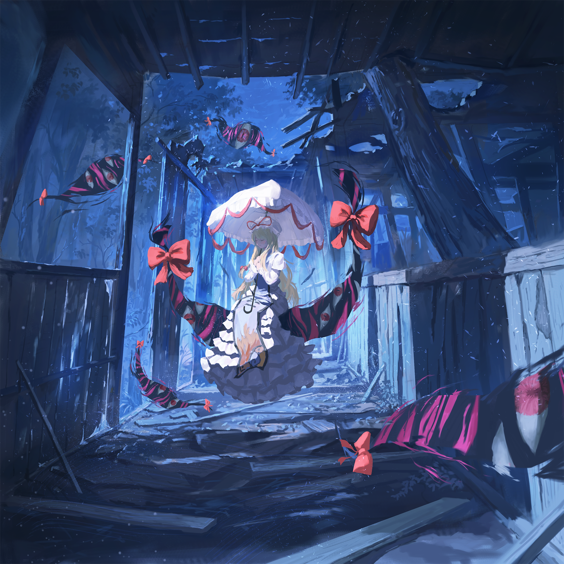 1girl album_cover blonde_hair blue_sky blue_theme blurry bow closed_eyes closed_mouth cloud commentary_request cover depth_of_field dress expressionless fjsmu flame_print forest gap_(touhou) hair_between_eyes hair_bow hands_up hat hat_ribbon highres holding holding_umbrella juliet_sleeves leaf light light_particles long_dress long_hair long_sleeves mob_cap moonlight nature night parted_bangs pink_eyes puffy_sleeves purple_vest red_bow red_eyes red_ribbon ribbon ribbon_trim ruins scenery shadow sidelocks sitting sky snowing solo star_(sky) starry_sky tabard touhou tree trigram umbrella very_long_hair vest white_dress white_hat white_umbrella wide_sleeves wind yakumo_yukari yin_yang yin_yang_print