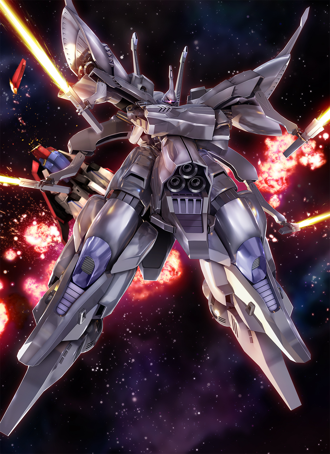 commentary_request damaged energy_sword explosion extra_arms glowing glowing_eye gundam highres looking_at_viewer mecha mobile_suit no_humans one-eyed pink_eyes robot sd_gundam_g_generation space star_(sky) sword titania_(mobile_suit) weapon zb_(dawn-blue) zeta_gundam zeta_gundam_(mobile_suit)