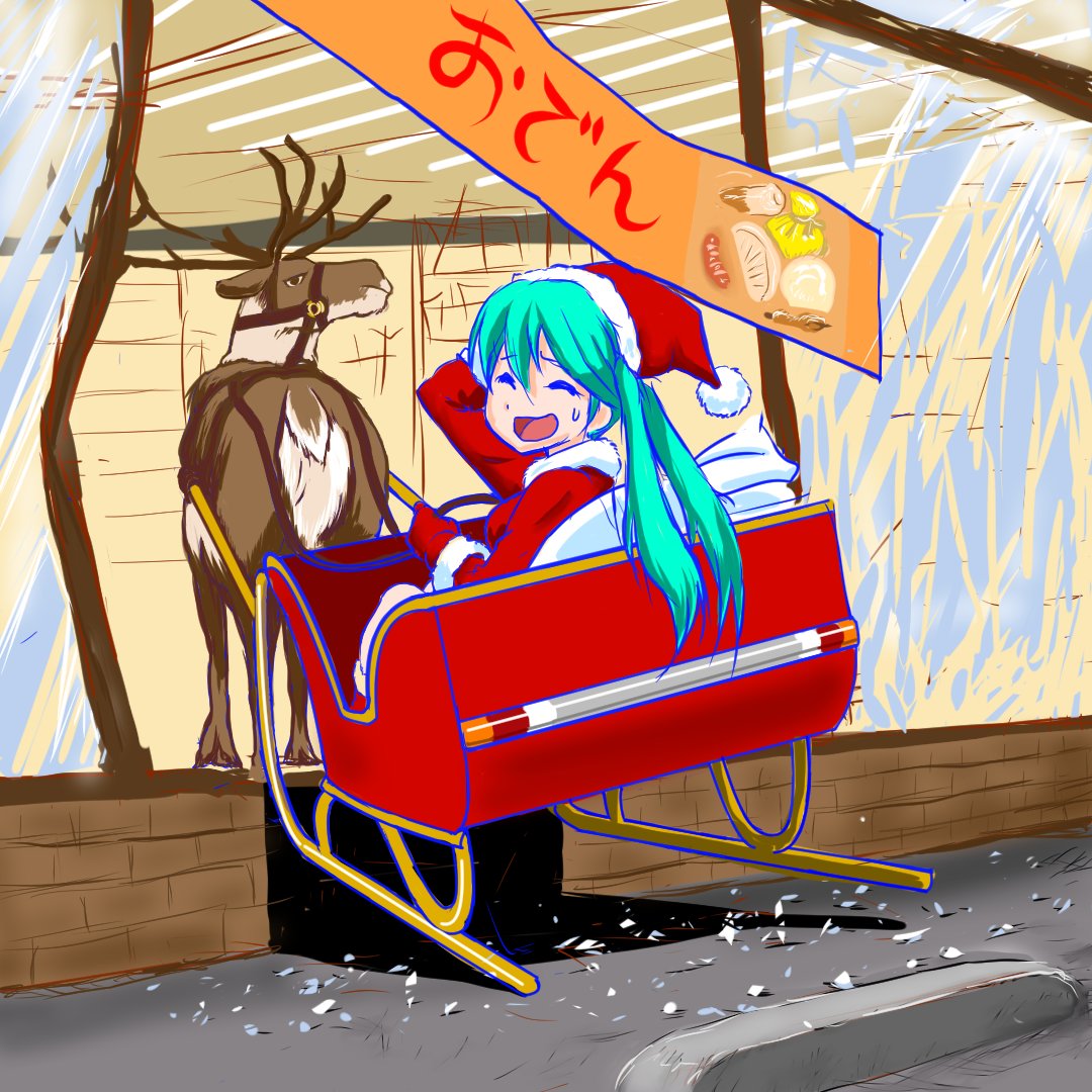 1girl animal aqua_hair banner blue_outline broken_glass broken_window christmas closed_eyes commentary crash dress facing_viewer failure food_print fur-trimmed_dress fur-trimmed_headwear fur_trim gapinelu glass harness hat hatsune_miku long_hair nervous_smile open_mouth outline pom_pom_(clothes) red_dress red_hat reindeer sack santa_costume santa_hat scratching_head shop sitting sleigh smile solo sweat translated twintails vocaloid window