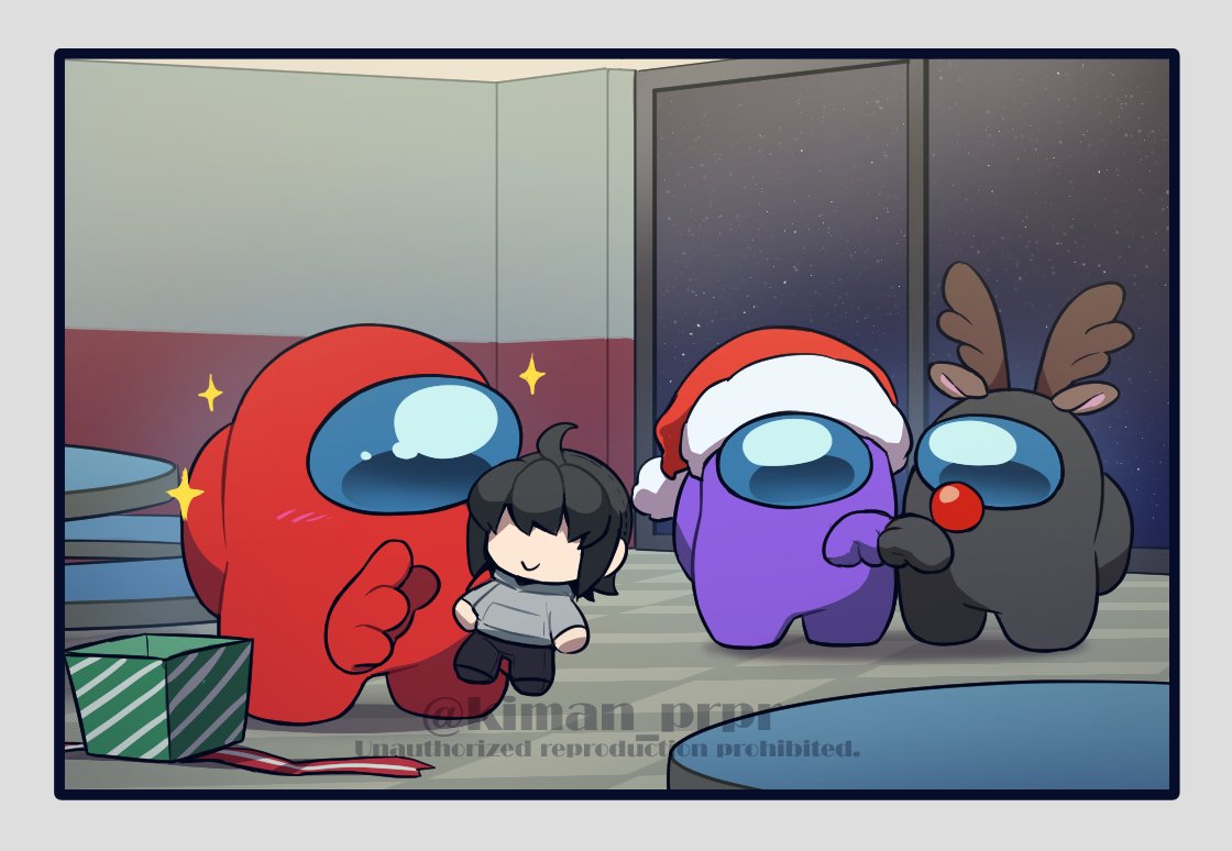 3others ambiguous_gender among_us animal_ears antlers black_(among_us) blue_(among_us) blush character_doll christmas commentary_request crewmate_(among_us) deer_ears disembodied_hand doll fake_animal_ears fake_antlers fist_bump gift helmet horns indoors kiman multiple_others opened_present red_(among_us) red_nose reindeer_antlers rudolph_the_red_nosed_reindeer space space_helmet spacesuit sparkle table they_(kiman) twitter_username window