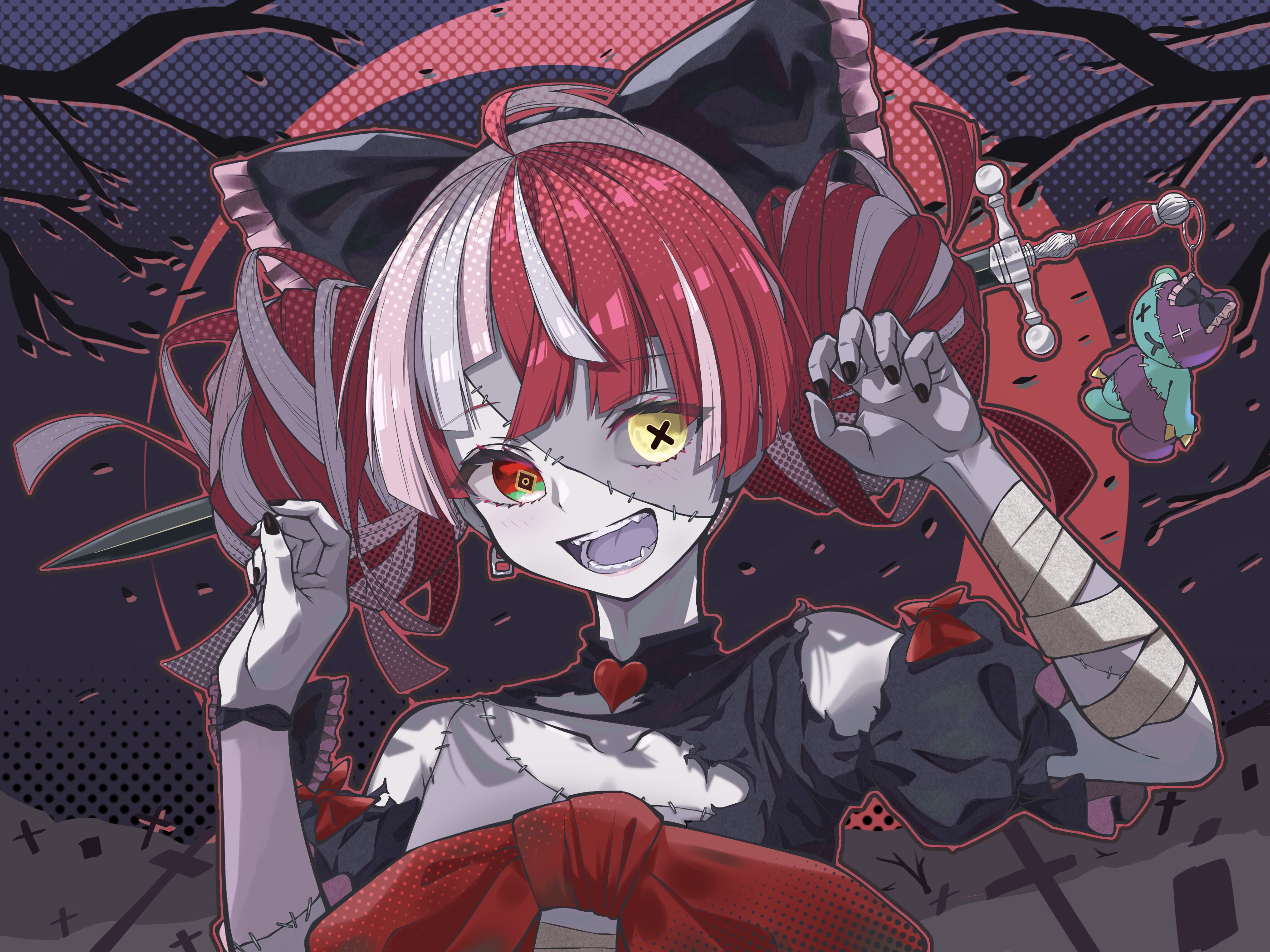 1girl :d ahoge bandaged_arm bandages bare_shoulders black_bow black_dress black_nails blunt_bangs blunt_ends bow claw_pose colored_skin colored_tongue diamond-shaped_pupils diamond_(shape) double_bun dress dress_bow fingernails gradient_eyes green_eyes grey_skin hair_bow hair_bun heterochromia highres hololive hololive_indonesia holoro impaled kureiji_ollie mismatched_pupils multicolored_eyes multicolored_hair multicolored_skin nail_polish open_mouth patchwork_skin pink_hair puffy_short_sleeves puffy_sleeves purple_tongue red_bow red_eyes red_hair sarashi short_sleeves silver_hair smile solo stitched_arm stitched_face stitched_torso stitches stuffed_animal stuffed_toy sword symbol-shaped_pupils teddy_bear torn_clothes torn_dress two-tone_skin u_da_desu udin_(kureiji_ollie) upper_body virtual_youtuber weapon white_skin x-shaped_pupils yellow_eyes zombie