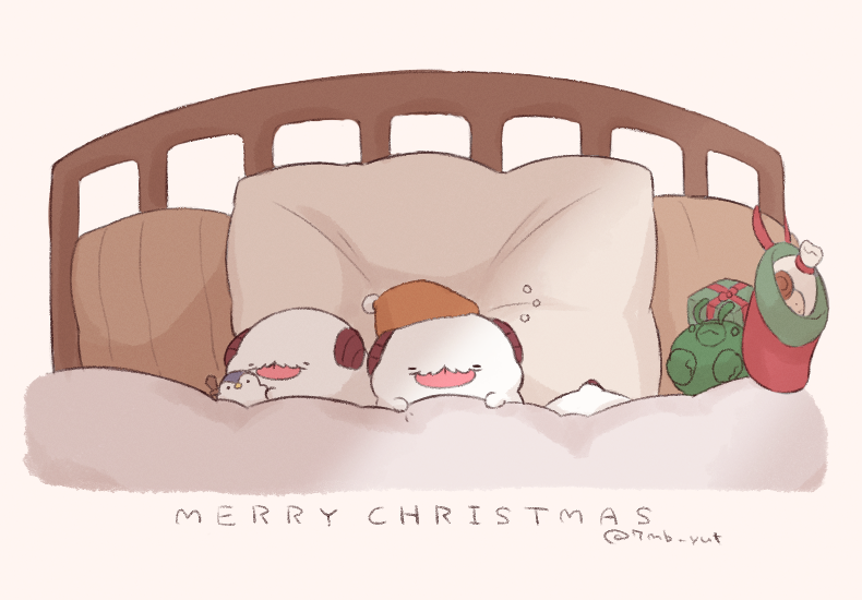 7mb_yut :p animal_focus artist_name bed bed_frame blanket closed_eyes gift holding holding_sword holding_toy holding_weapon horns league_of_legends merry_christmas mixed-language_commentary no_humans pillow poro_snacks simple_background sleeping stuffed_animal stuffed_penguin stuffed_toy sword tongue tongue_out toy weapon white_background
