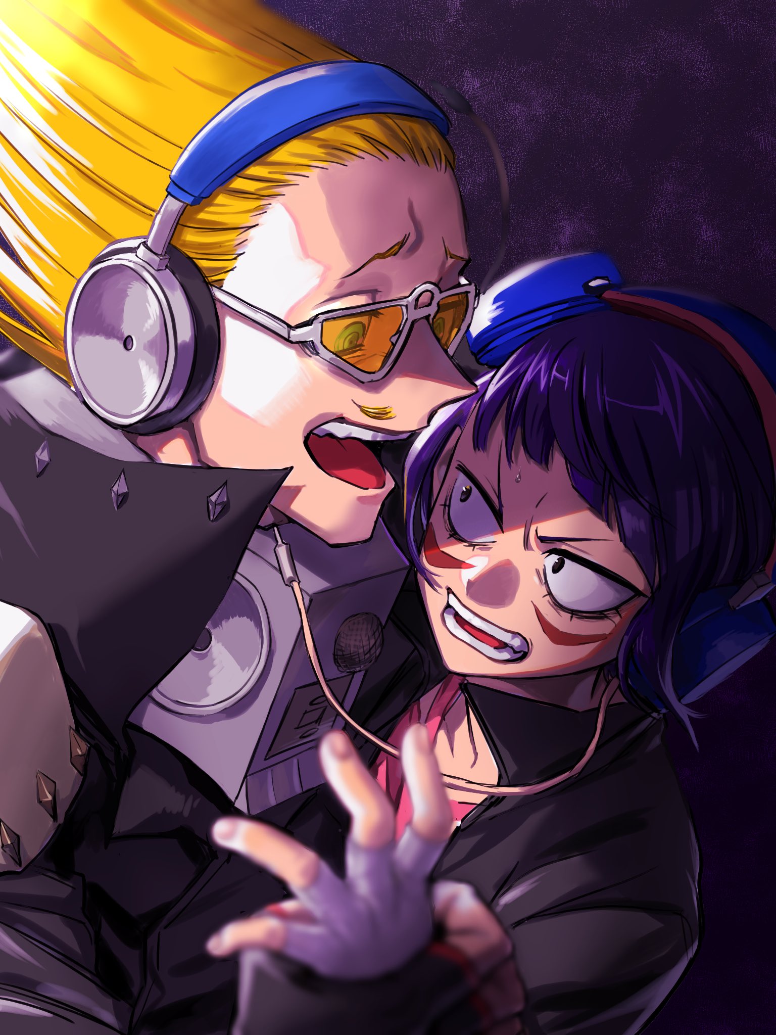 1boy 1girl amplifier annoyed audio_jack black_hair black_jacket blonde_hair blurry blurry_foreground boku_no_hero_academia close-up costume dark_background eye_contact facial_hair fingerless_gloves gloves hair_up headphones highres holding_another's_wrist jacket jiro_kyoka long_hair looking_at_another mustache open_mouth osutoraria_(1ndi_g0) present_mic short_hair simple_background speaker teacher_and_student teeth tinted_eyewear upper-body upper_teeth_only