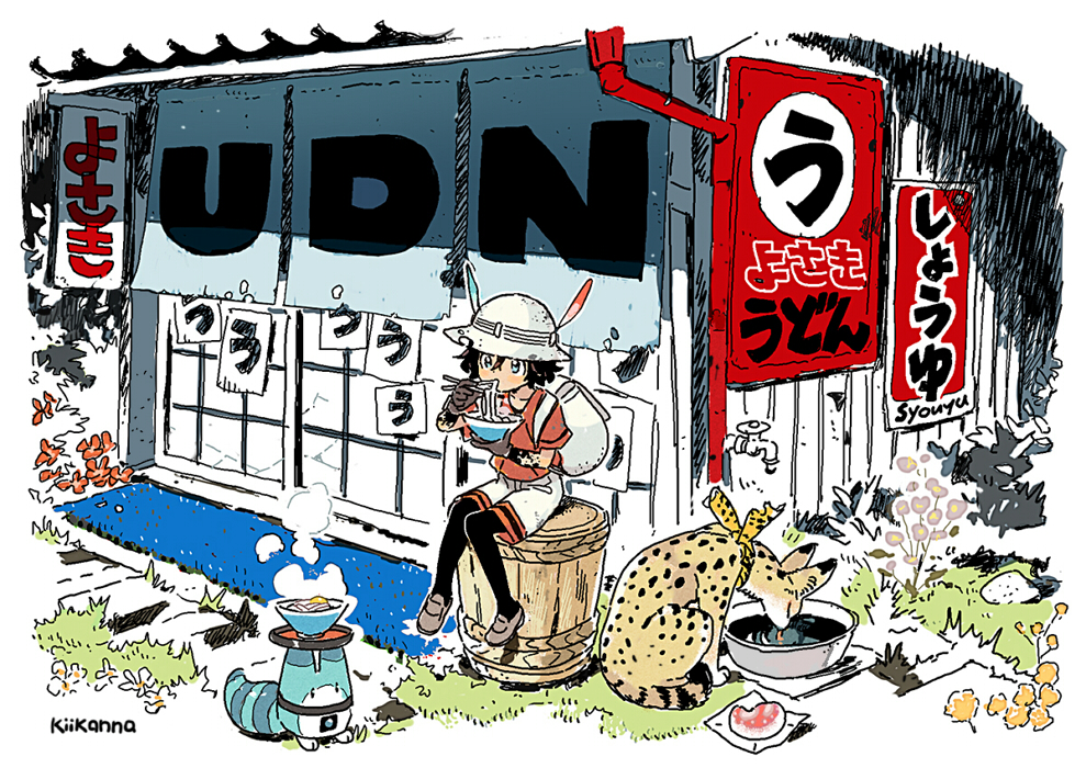 1girl animal animal_print aqua_eyes arm_up backpack bag barrel black_gloves black_hair black_pantyhose blue_eyes border bowl brown_footwear bush chopsticks dot_nose downscaled drainpipe drinking eating egg egg_(food) faucet flower food food_in_mouth food_stand foot_dangle fried_egg from_side gloves grass hair_between_eyes hand_up hat_feather hatching_(texture) helmet holding holding_bowl holding_chopsticks holding_food industrial_pipe japari_bun kaban_(kemono_friends) kemono_friends kiikanna knees_together_feet_apart linear_hatching loafers lucky_beast_(kemono_friends) noodles noren orange_flower outdoors pantyhose pantyhose_under_shorts pith_helmet plant print_gloves purple_flower red_shirt resized rock romaji_text rope scenery serval serval_(kemono_friends) shade shirt shirt_tucked_in shoes short_hair short_sleeves shorts sign signature sitting steam tareme udon water white_bag white_border white_flower white_headwear white_shorts wide_shot yatai yellow_flower
