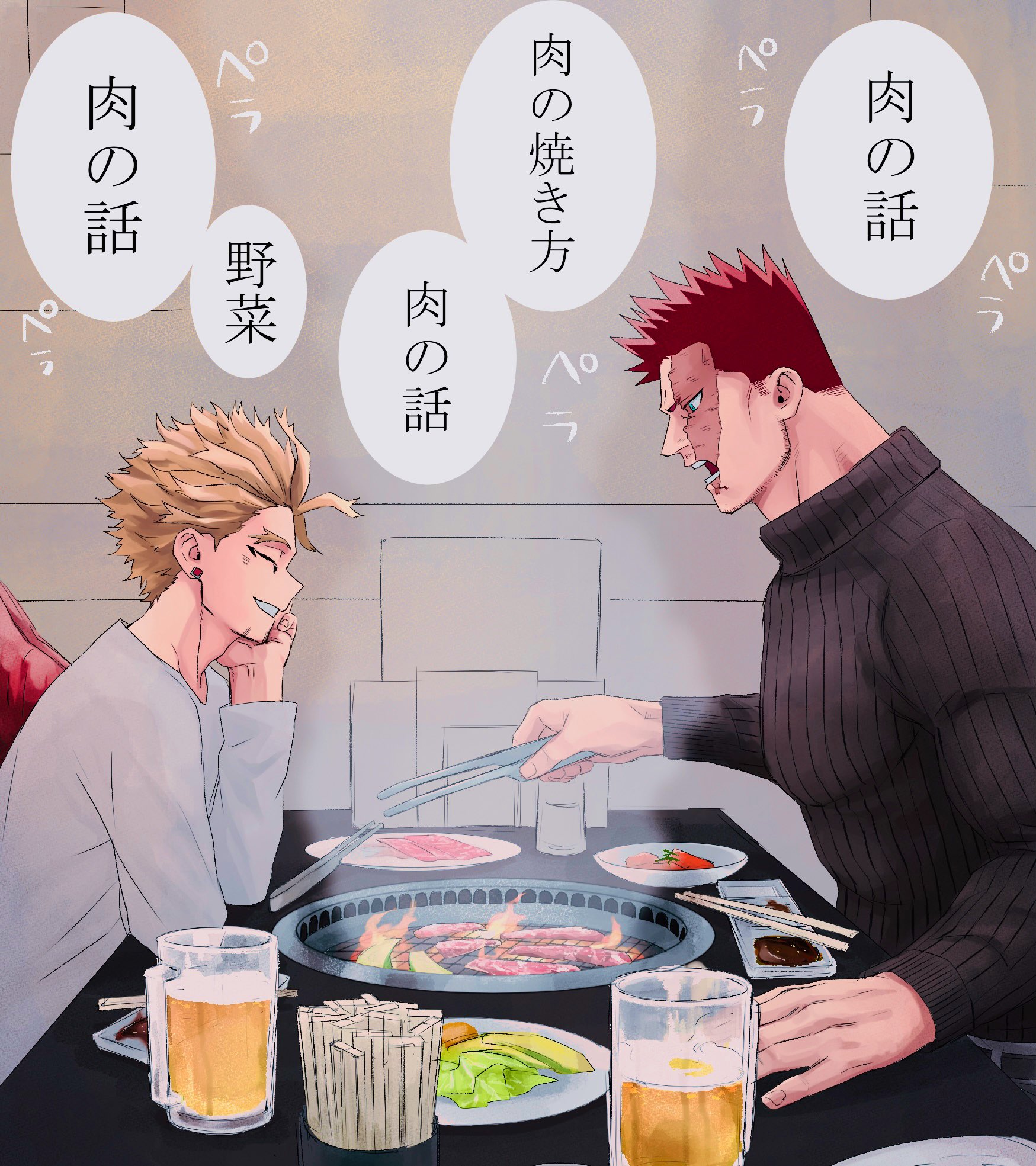 2boys alcohol bad_id bad_twitter_id beard beer beer_mug blonde_hair blue_eyes boku_no_hero_academia burn_scar chopsticks condiment cooking cup earrings elbows_on_table endeavor_(boku_no_hero_academia) facial_hair feathers fire food goatee grilling hawks_(boku_no_hero_academia) head_on_hand highres jewelry kei_(ahan_uhun_345) leaning_on_table long_sleeves male_focus meat mug multiple_boys red_feathers red_hair red_wings restaurant scar scar_on_face smile smoke speech_bubble stud_earrings sweater talking translation_request undercut wings yakiniku yaoi