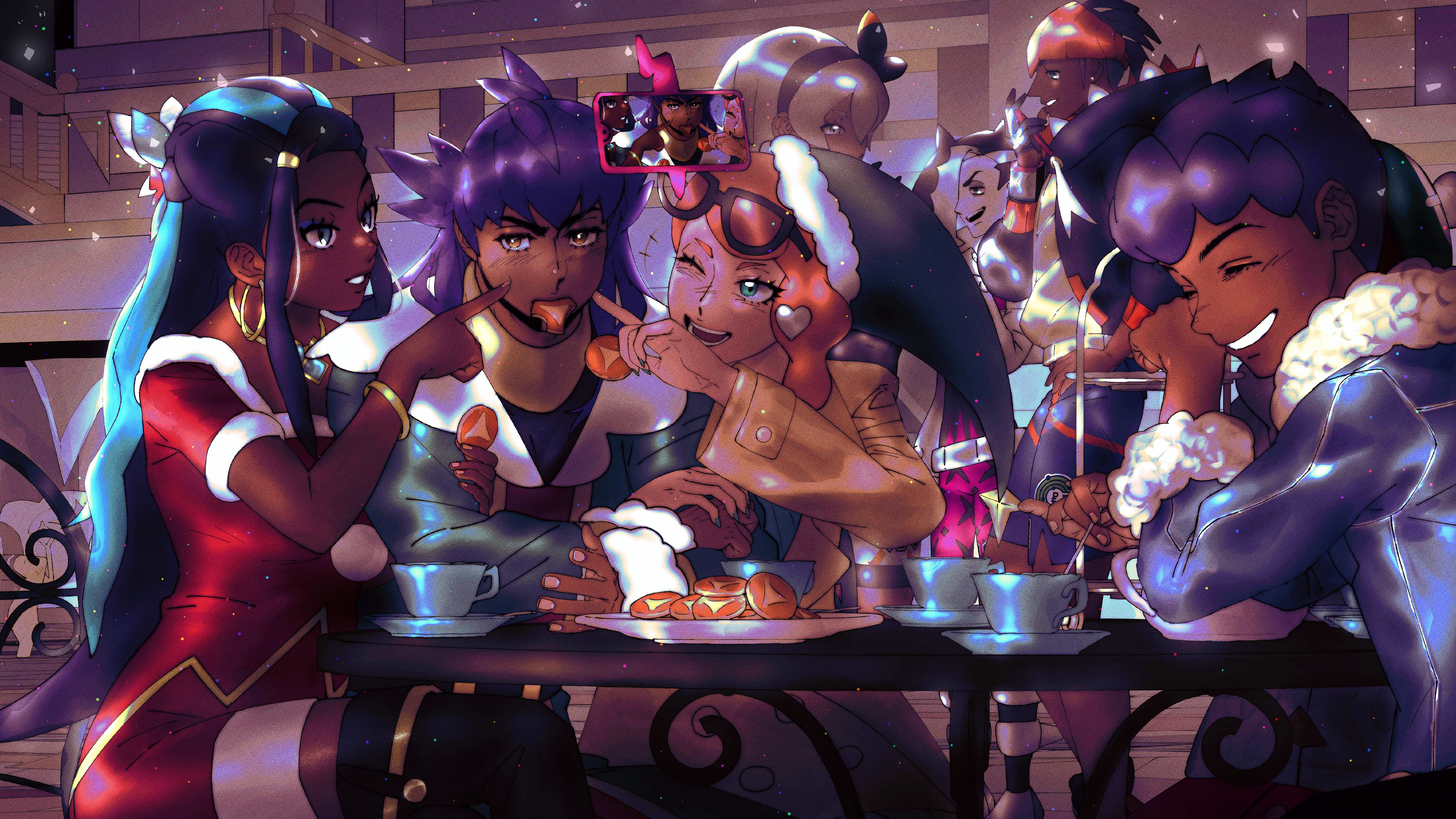 +++ 4boys 4girls absurdres bea_(pokemon) black_hair black_hairband black_hoodie blue_hair blue_jacket bow_hairband bracelet bright_pupils brown_coat cardigan chair cheek_poking christmas closed_eyes coat commentary_request cup dark-skinned_female dark-skinned_male dark_skin dynamax_band earrings facial_hair film_grain fur-trimmed_jacket fur_trim gen_4_pokemon gloria_(pokemon) gloves green_coat green_eyes green_headwear grey_cardigan grey_hair grin gym_leader hair_ornament hairband hat headband heart heart_hair_ornament highres hood hoodie hoop_earrings hop_(pokemon) jacket jewelry leon_(holiday_2021)_(pokemon) leon_(pokemon) long_hair mer_(watercups) mouth_hold multicolored_hair multiple_boys multiple_girls necklace nessa_(holiday_2021)_(pokemon) nessa_(pokemon) nintendo official_alternate_costume orange_hair orange_headband outdoors piers_(pokemon) plate pokemon pokemon_(creature) pokemon_masters_ex pokemon_sword_and_shield poking purple_hair raihan_(pokemon) rotom rotom_phone santa_hat saucer short_hair sidelocks sitting smile sonia_(pokemon) table tam_o'_shanter teacup three-quarter_sleeves two-tone_hair white_pupils yellow_eyes